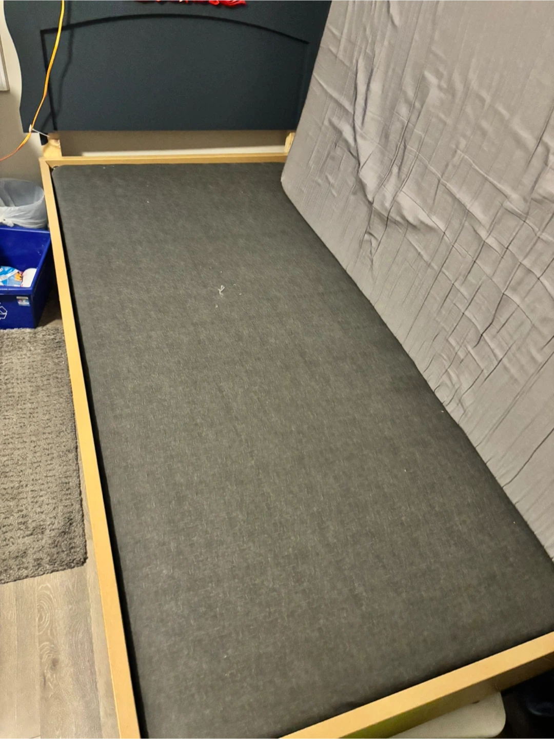 Selling a single bed frame with a headboard. The frame is a light wood colour and the headboard is a dark blue with a red design. Mattress can or cannot be included, has always had a mattress protector. Frame has been taken apart but very easy to put back together. Tool included. $60
