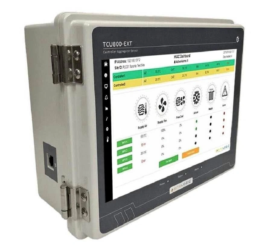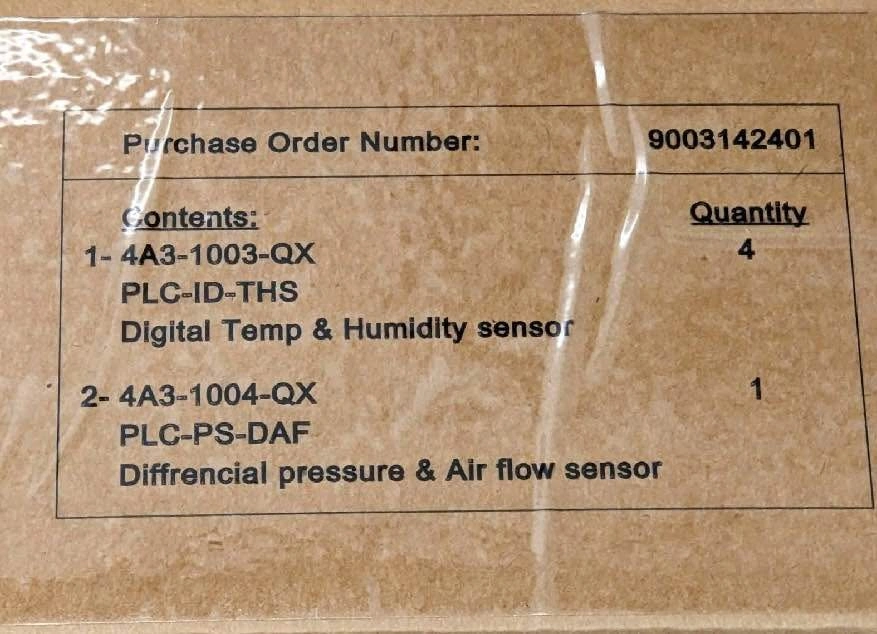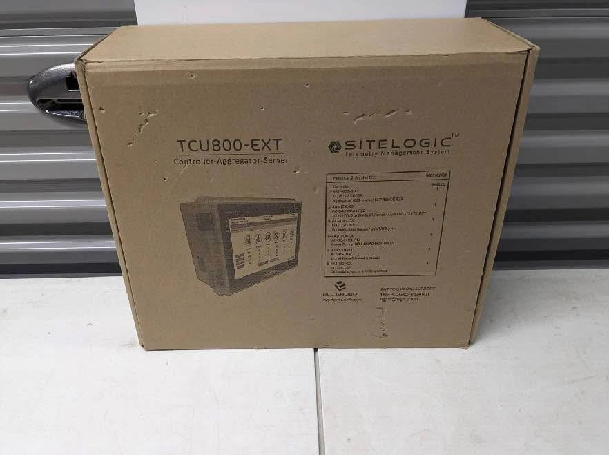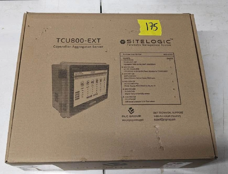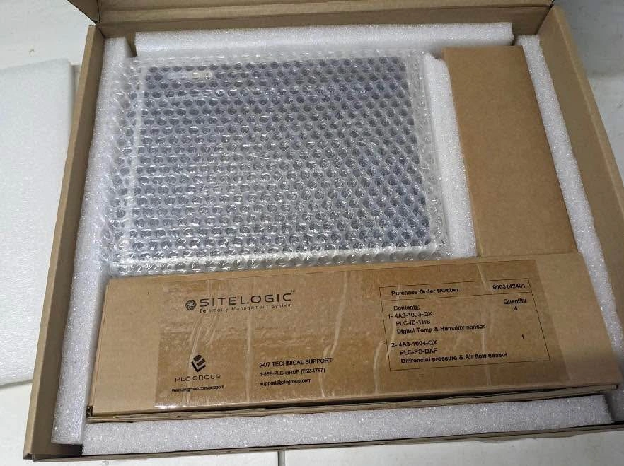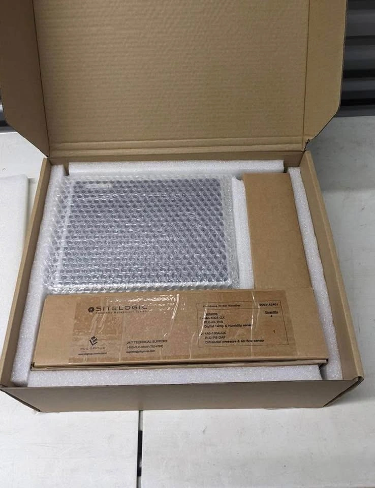 NEW Sitelogic TCU800-EXT Controller designed for managing HVAC and environmental systems. The package includes the main unit, digital temperature and humidity sensors (4 pieces: PLC-ID-THS), and one differential pressure & airflow sensor (PLC-PS-DAF). The unit is new, unused, and comes in its original packaging with foam padding for protection.