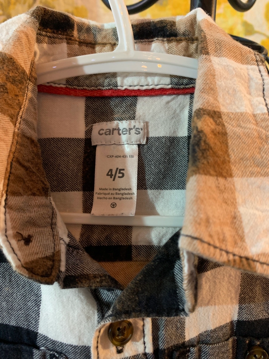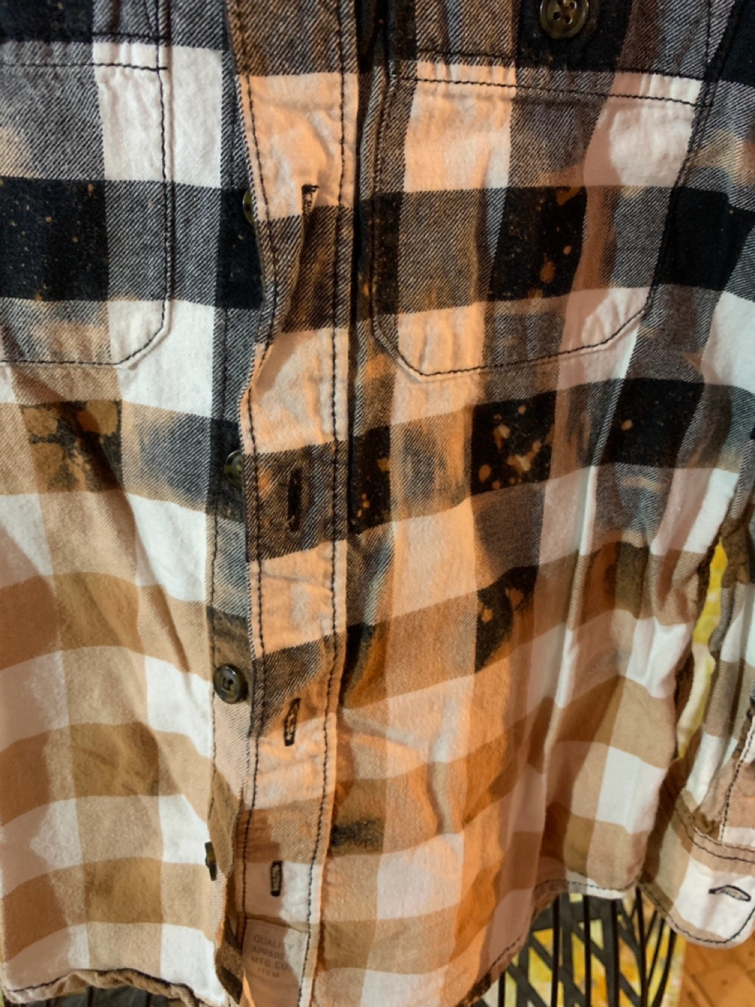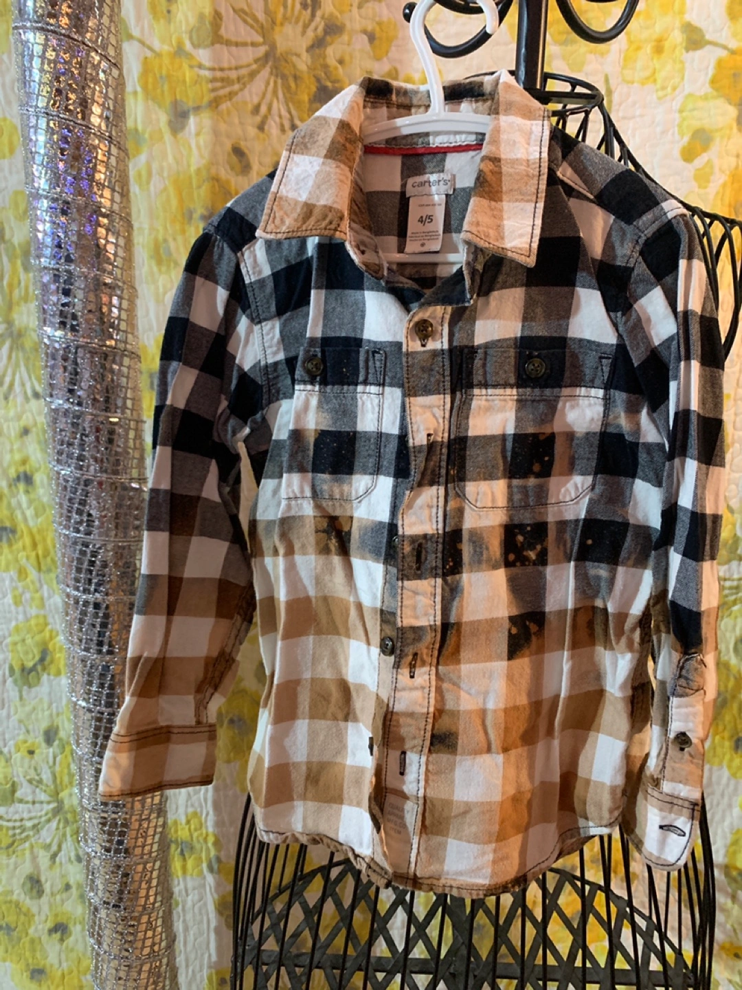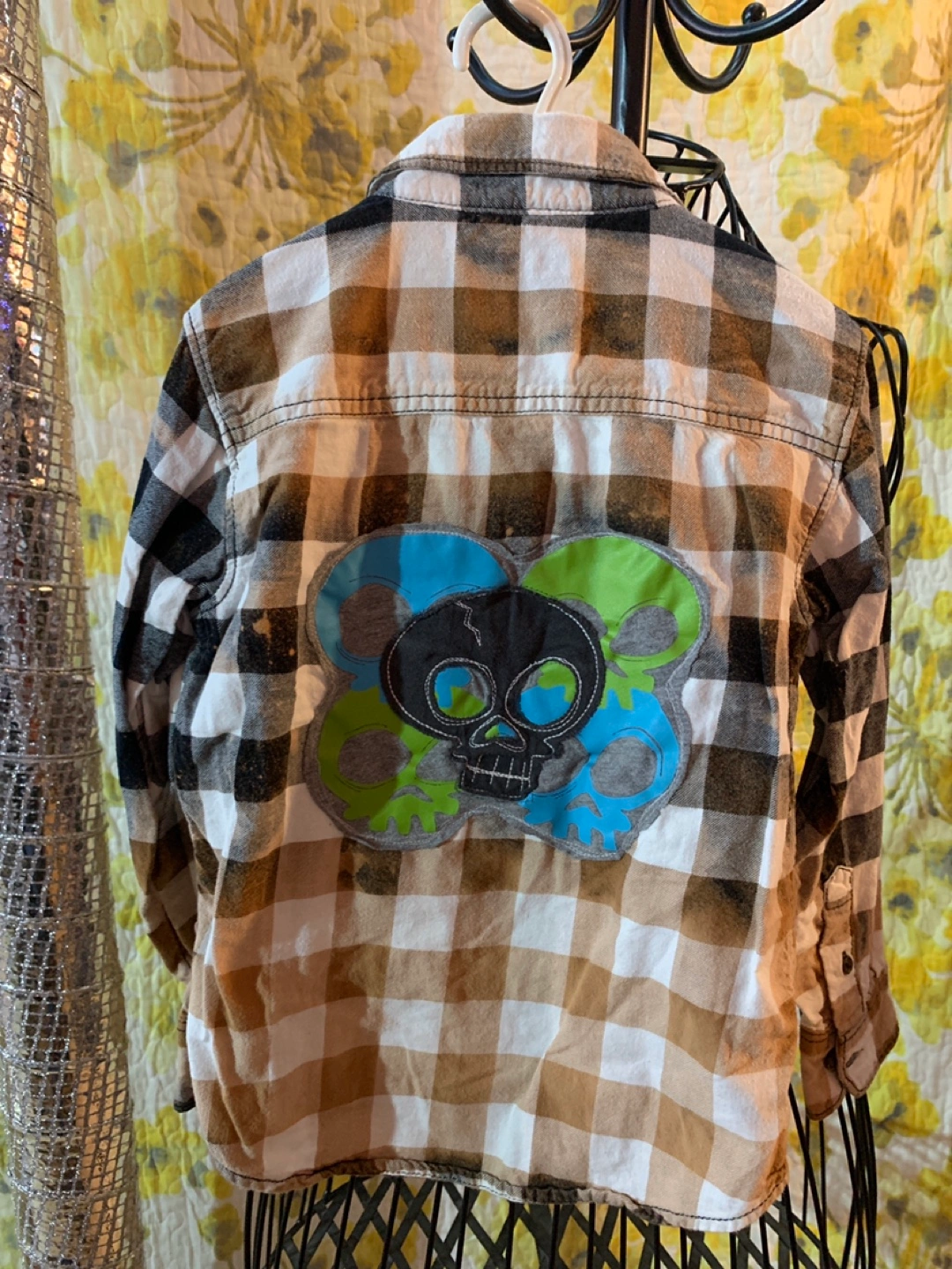 Cute kids’ flannel shirt. Size 4/5. Hand Bleach-dyed effect. Features a unique skull patch appliquéd on the back. Long sleeves, button closure. OOAK-Maun by Gerri