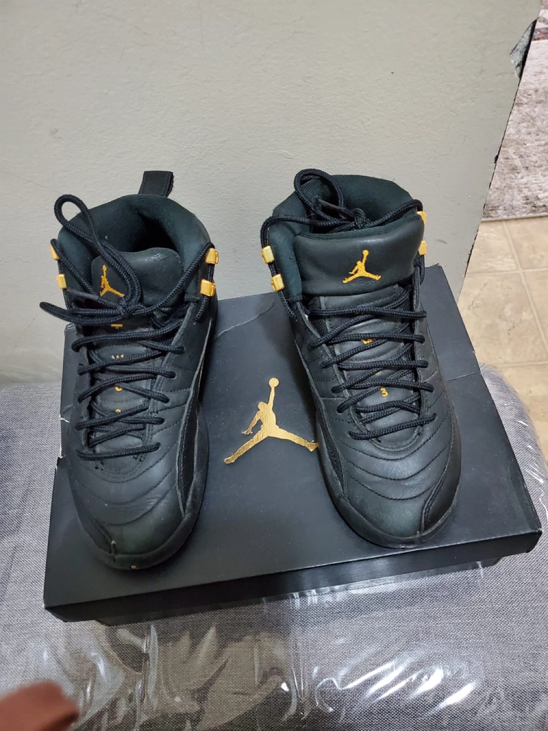 Kids' size Air Jordan 12 Retro sneakers. Black leather upper, gold accents. Pre-owned, some wear.
