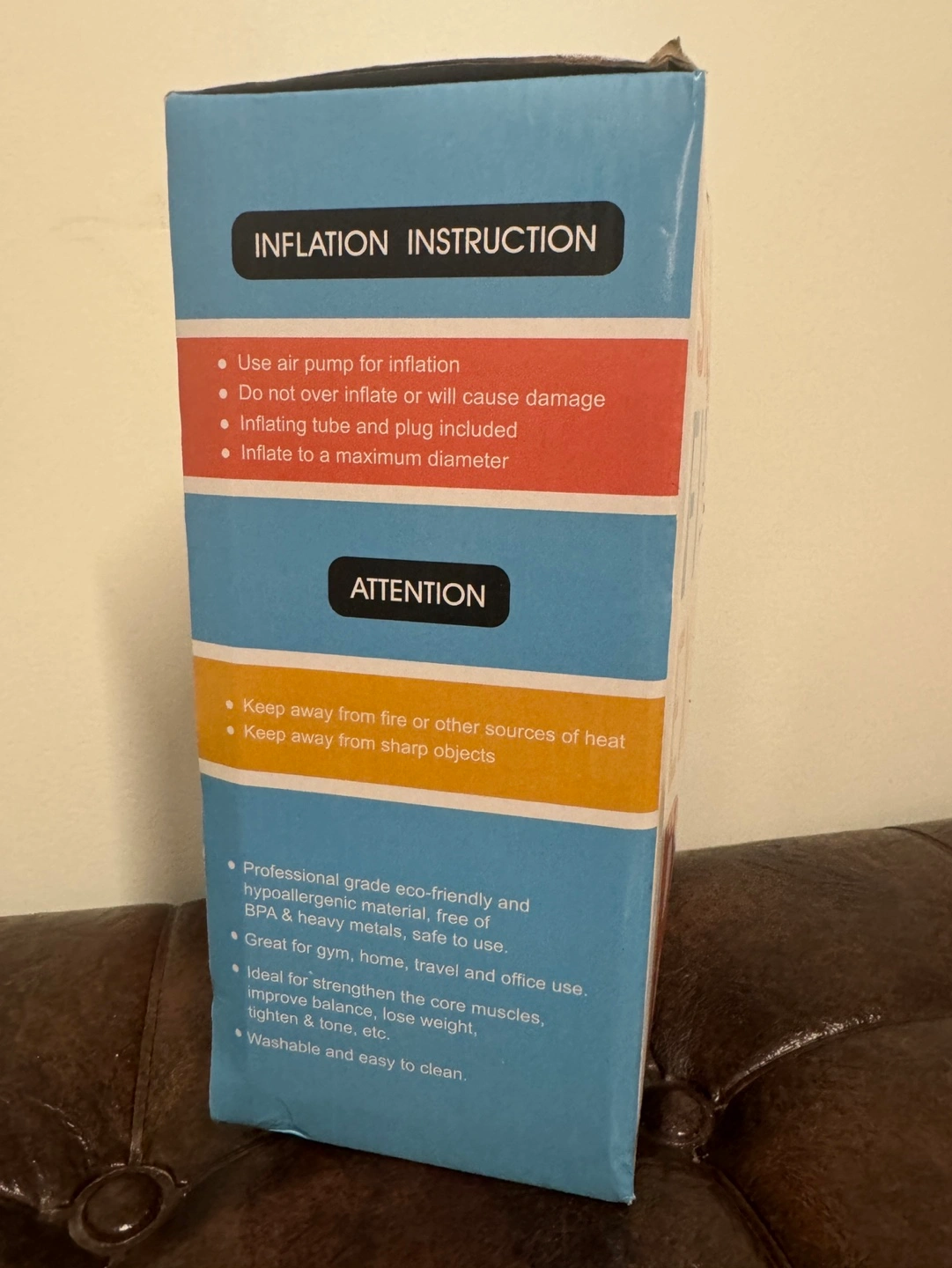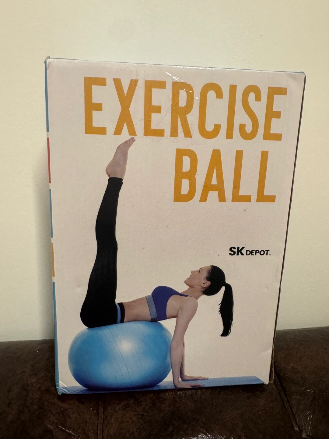 New exercise ball. Various sizes and colours available. Hypoallergenic material, BPA & heavy metals free. Great for home, gym, and office use. Improves strength, balance, core muscles. Washable and easy to clean.