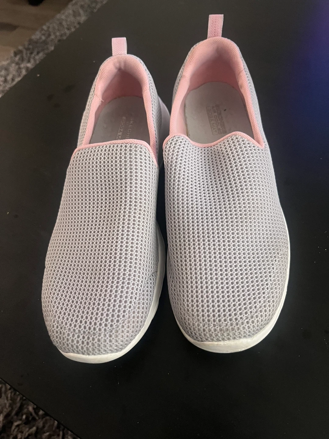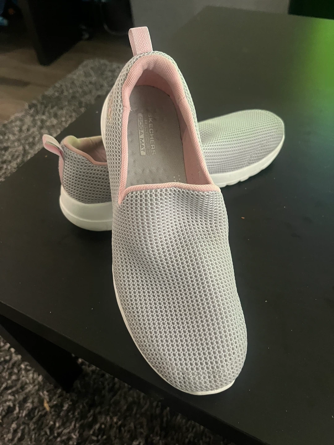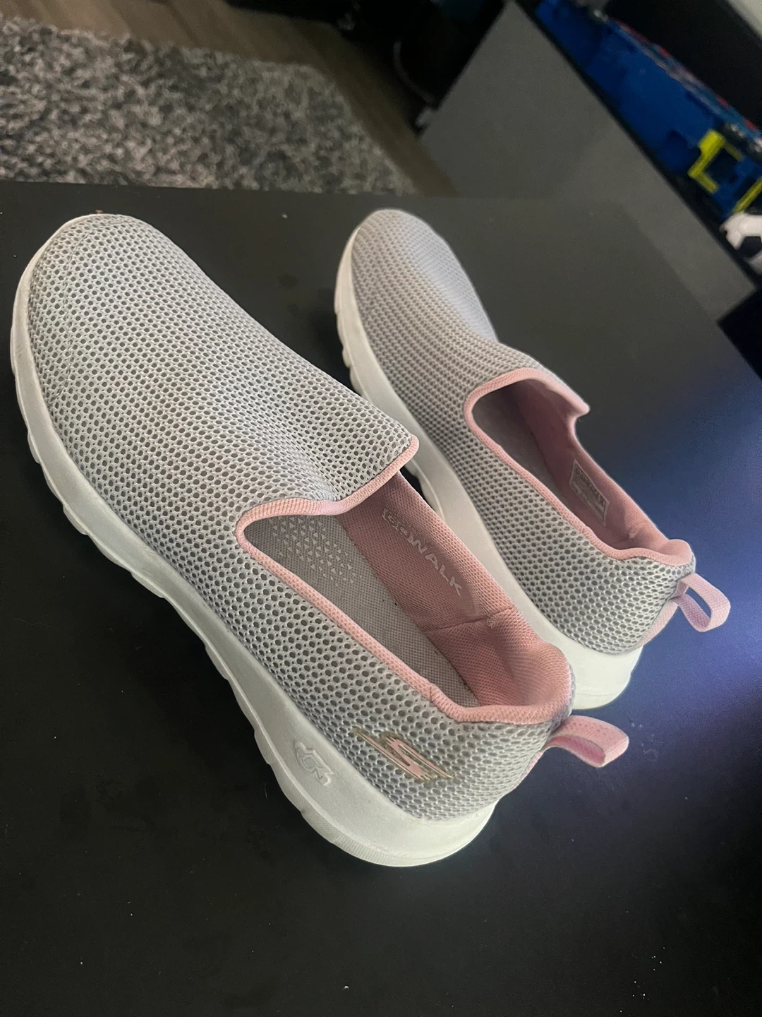 Selling a pair of Skechers GOwalk slip-on shoes! They're a women's size 8 and feature a light grey mesh upper with a pink trim. Super comfy and easy to slip on for everyday wear