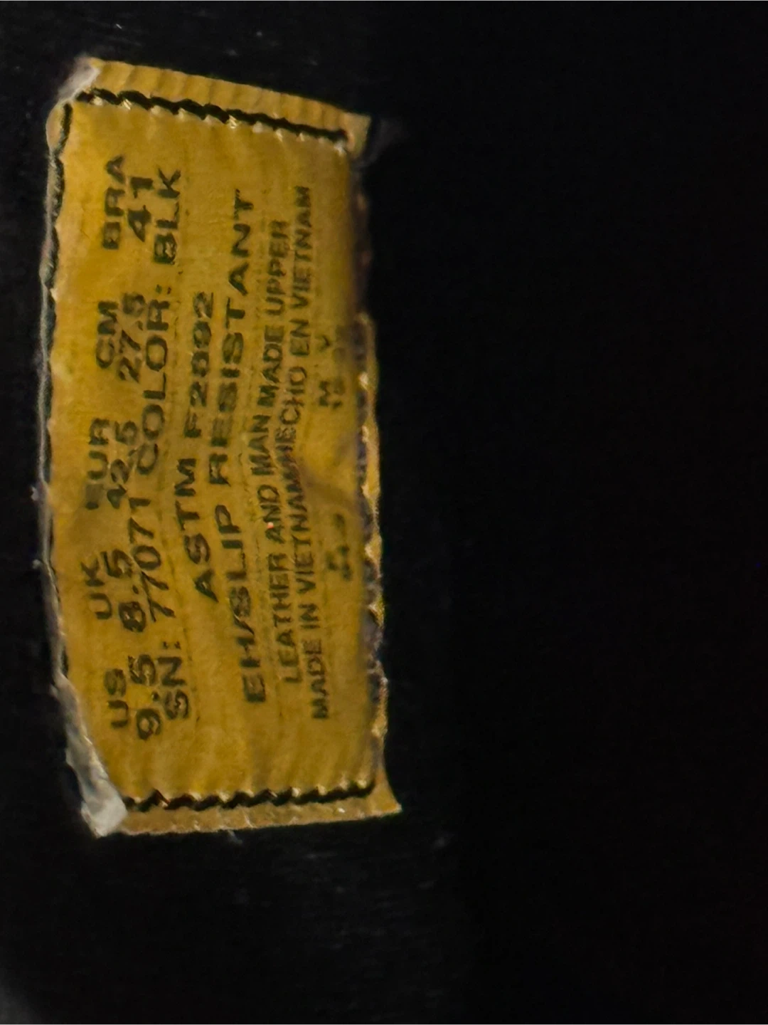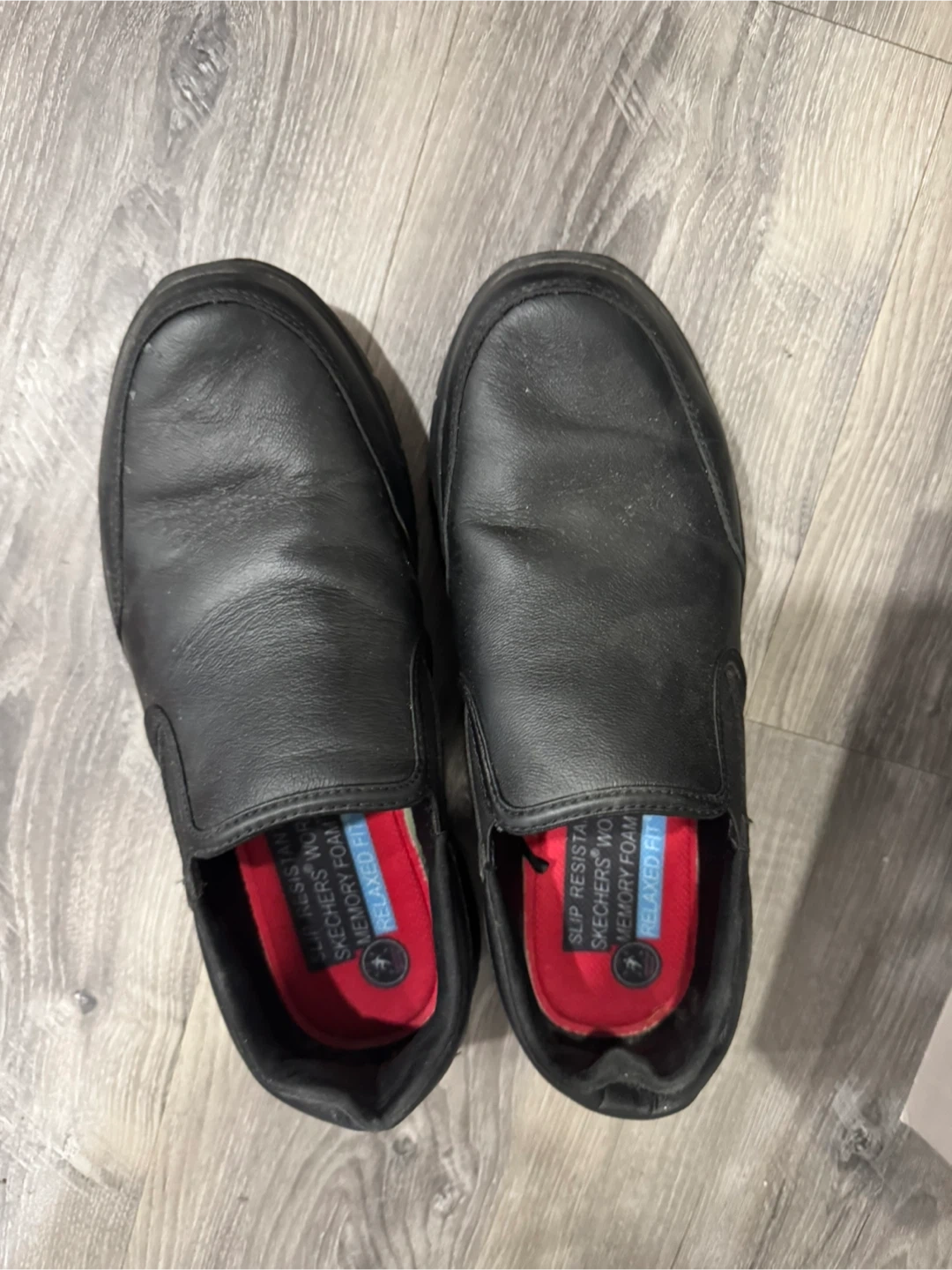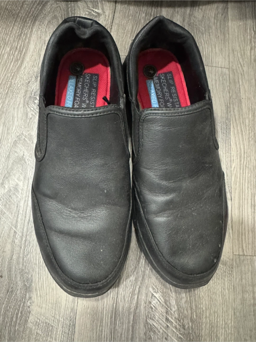 Selling a pair of Skechers Work Relaxed Fit slip-resistant shoes in black. They're a US size 9.5. These are great for anyone needing comfortable and safe footwear for work