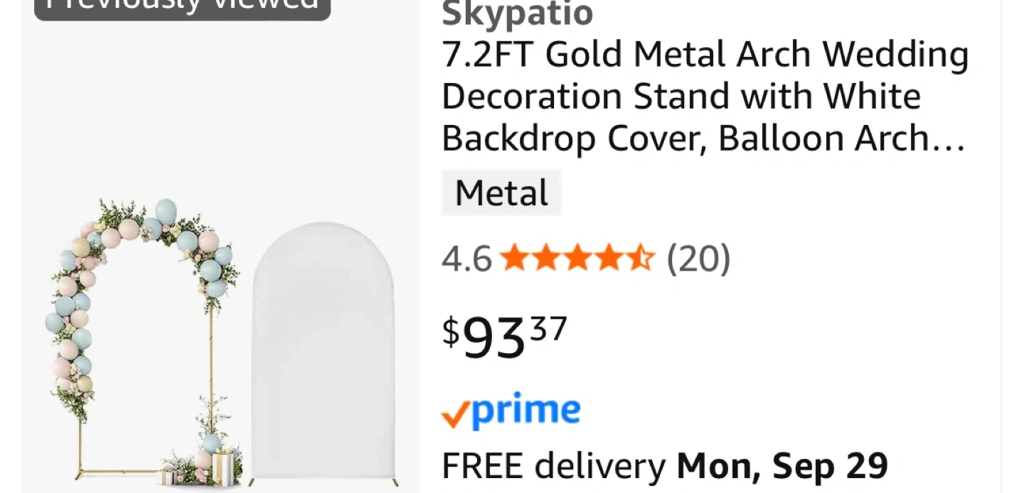 Selling a Skypatio 7.2FT Gold Metal Arch Wedding Decoration Stand. It comes with a white backdrop cover and is perfect for balloon arches. Originally bought for $93.37!