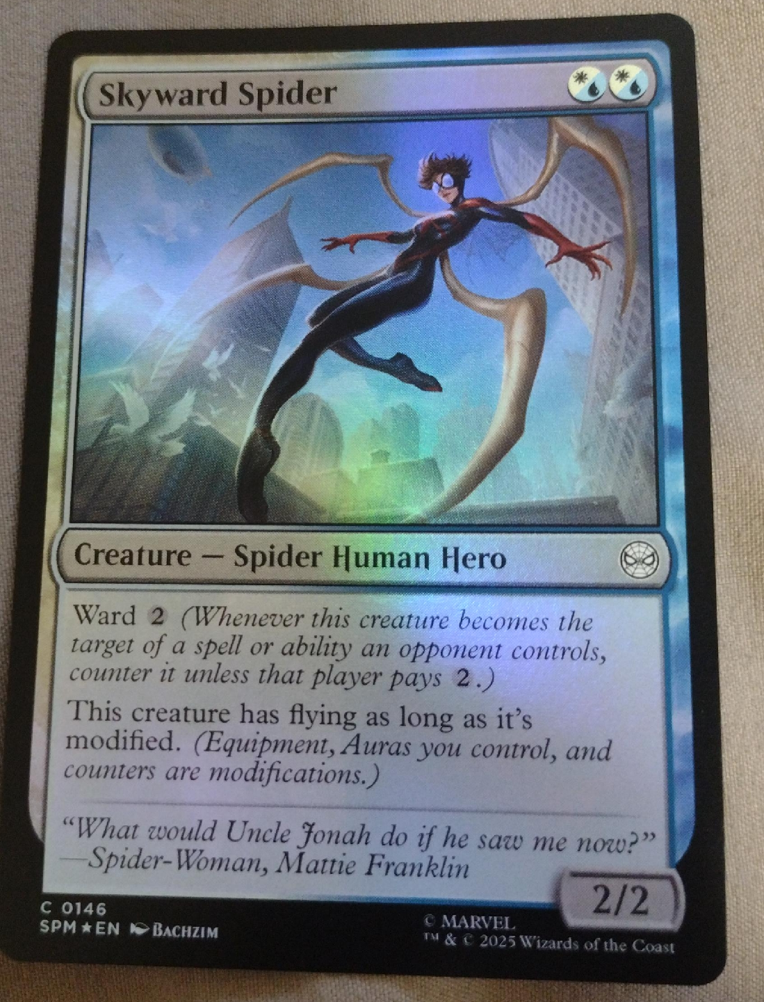 Selling a Skyward Spider card from Marvel's MTG collection! It's a Creature - Spider Human Hero card. The card has Ward 2 and flying abilities.