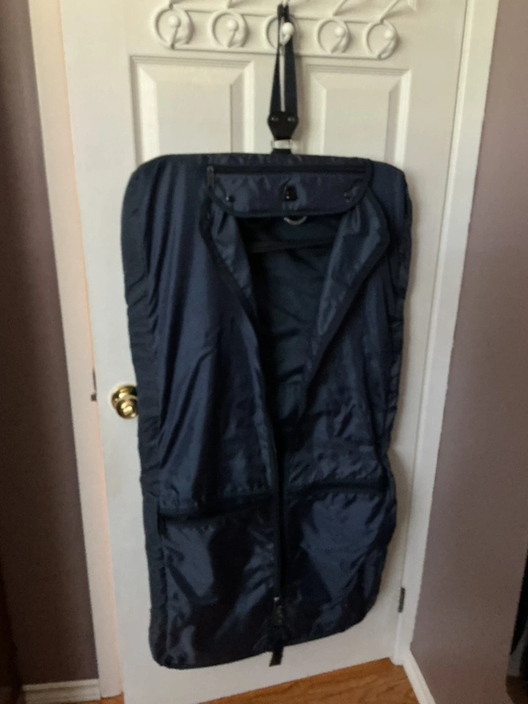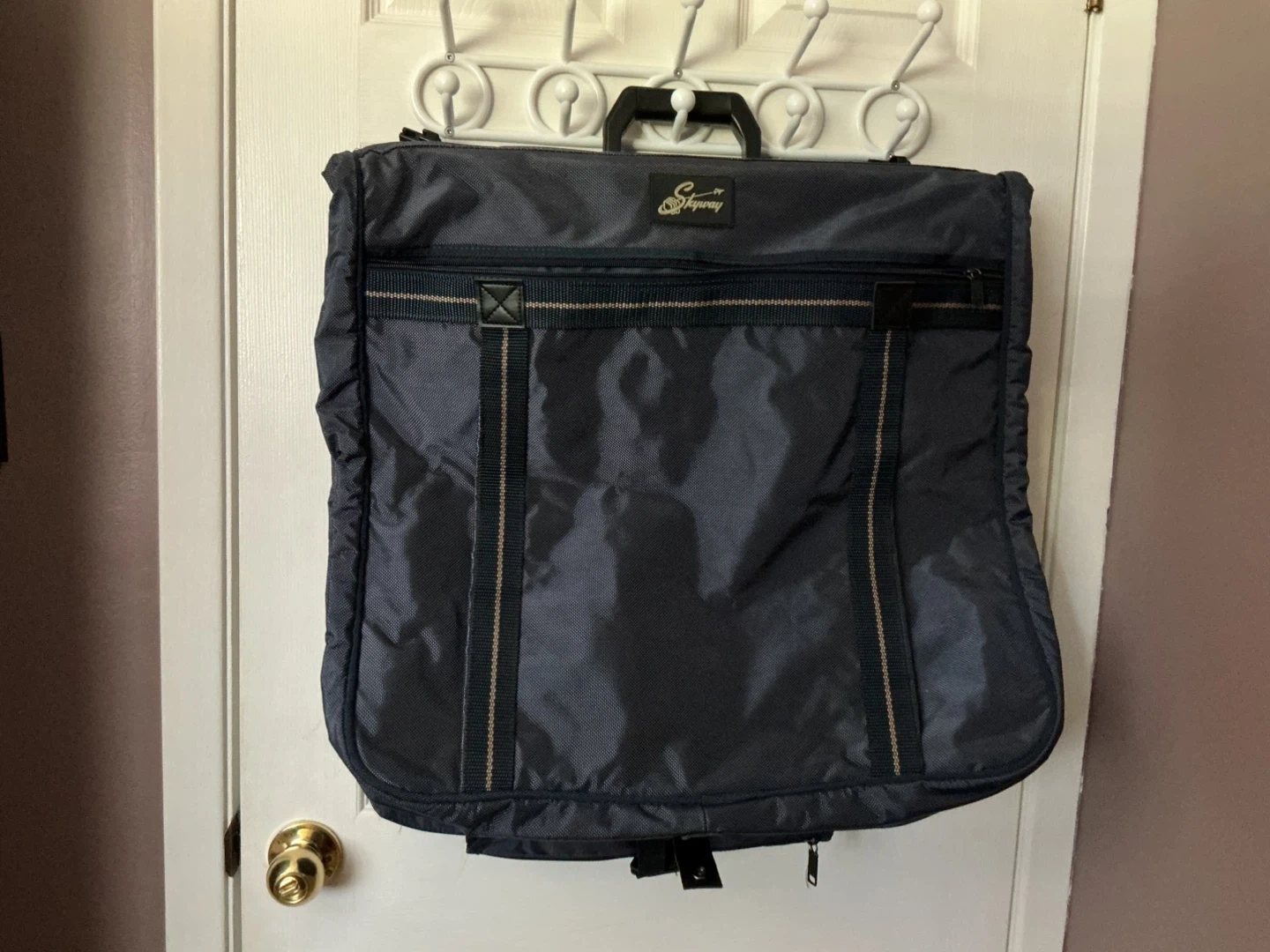 Selling a Skyway garment bag in navy blue. It's in great condition and perfect for travel or storing your suits and dresses. Has a handle on top for easy carrying and a zipper for closure. Great for keeping your clothes wrinkle-free! New condition, never used.