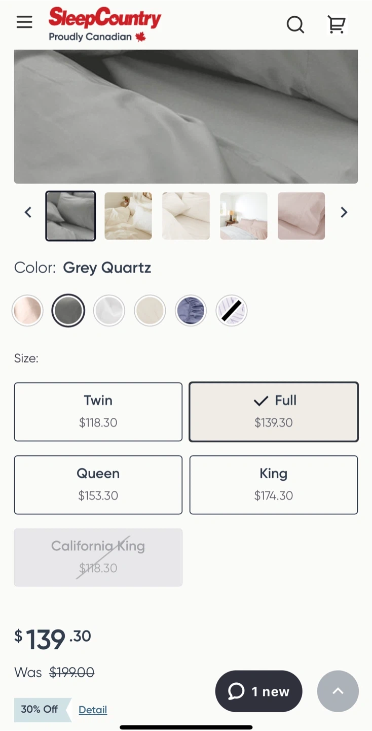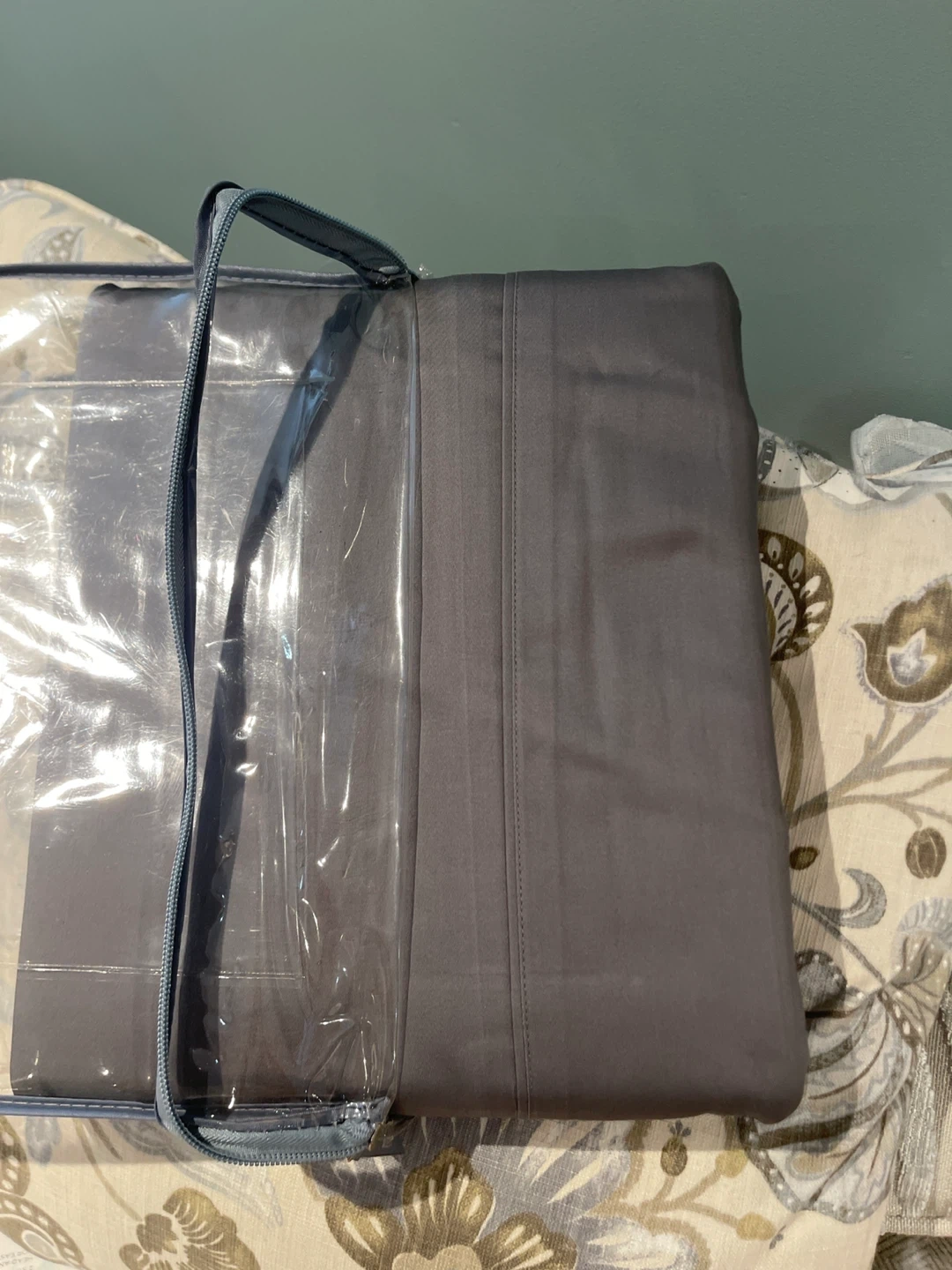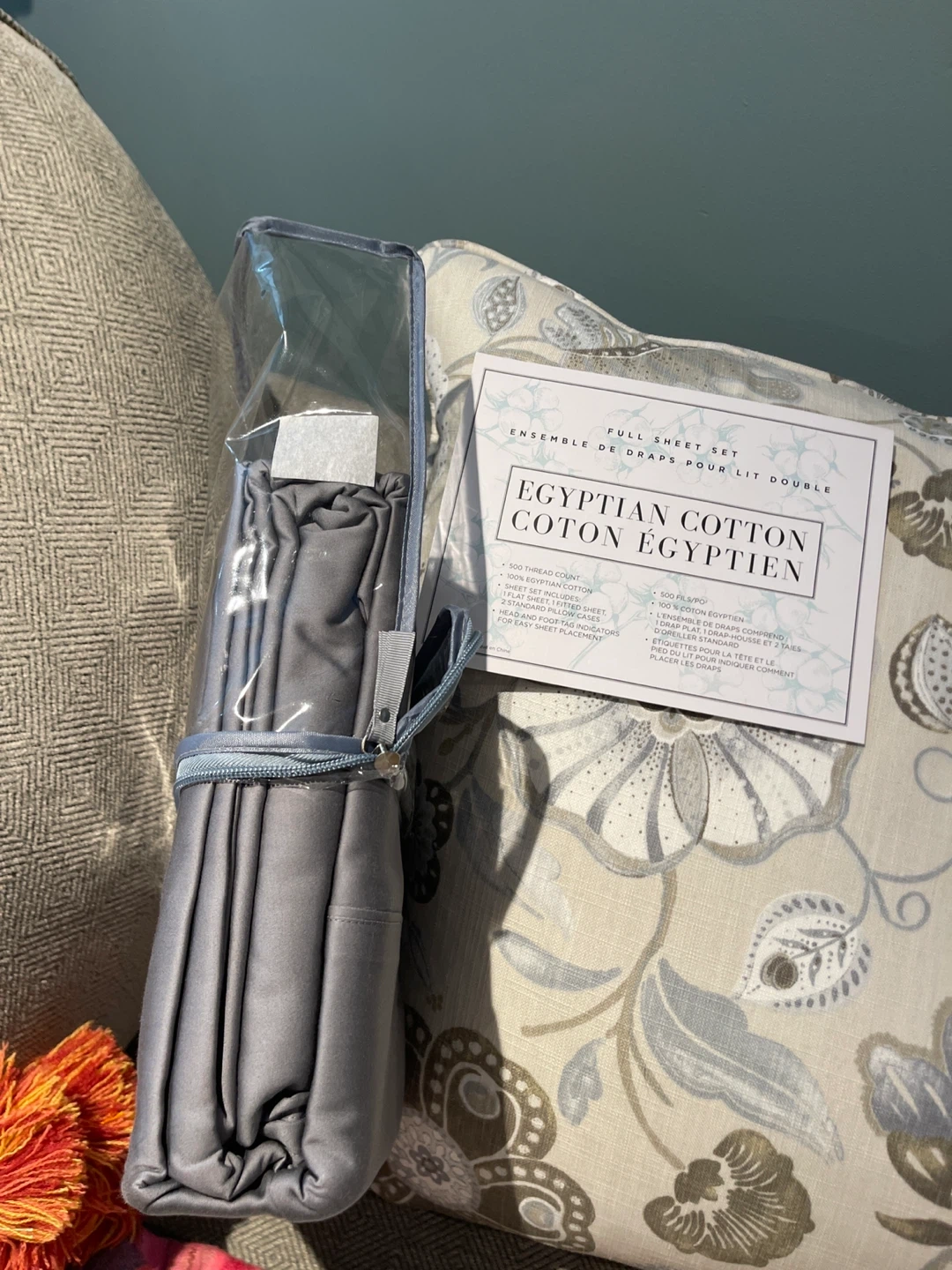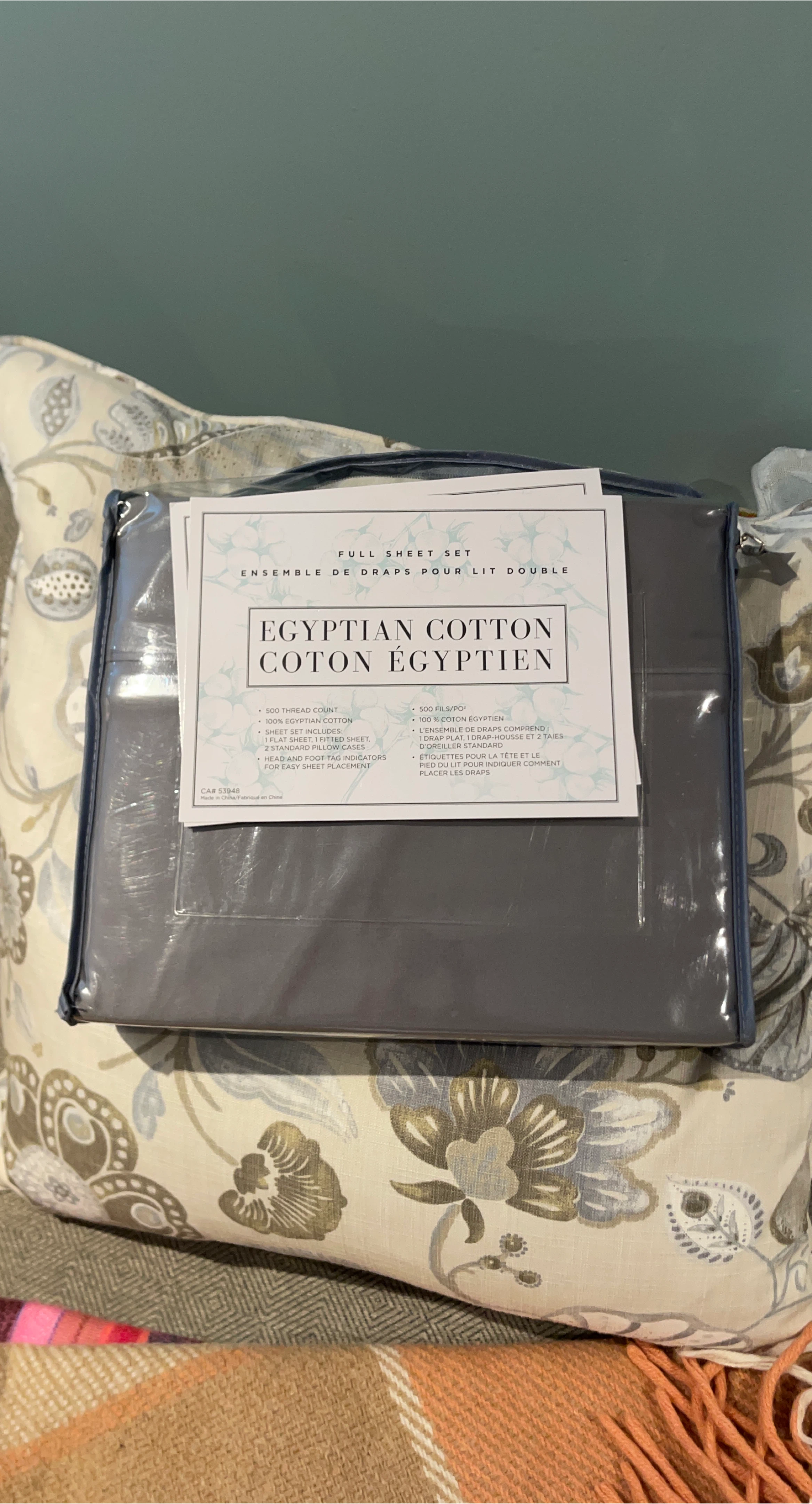Selling a brand new Sleep Country Egyptian Cotton full sheet set in Grey Quartz. This set includes: - 500 thread count - 1 flat sheet - 1 fitted sheet - 2 standard pillowcases Originally priced at $139.30, it's a great deal for a luxurious set of sheets!