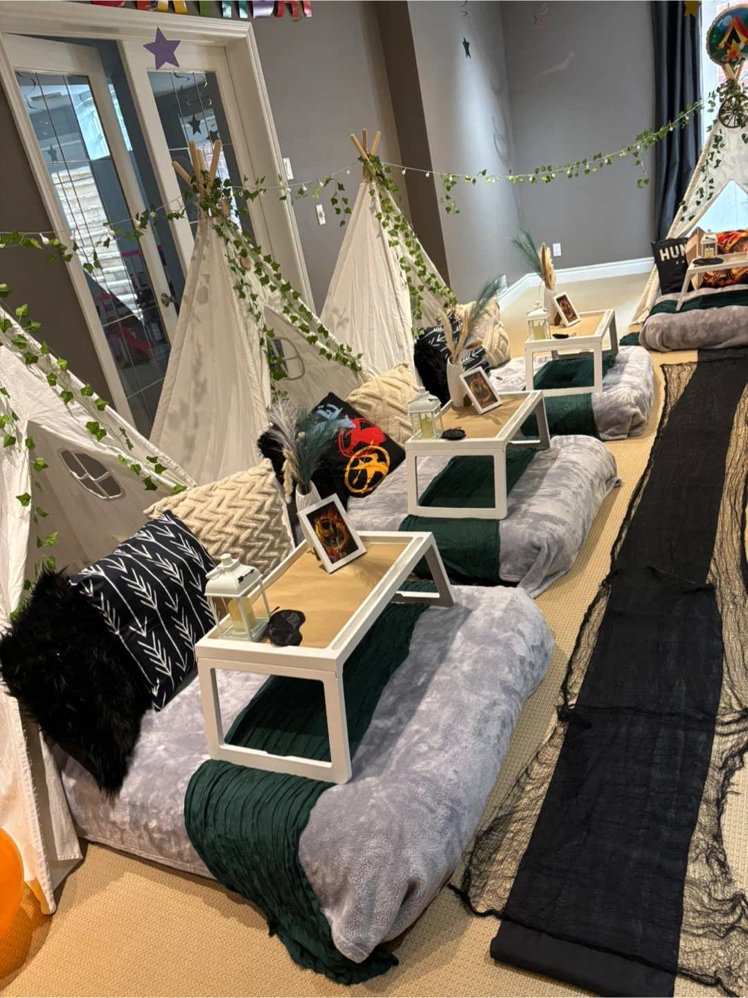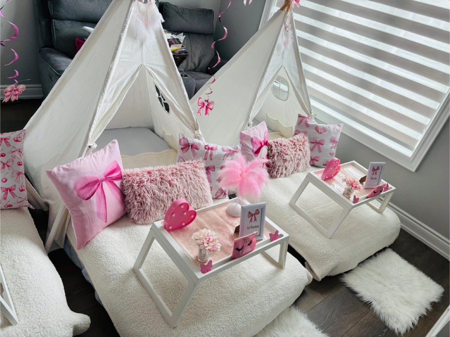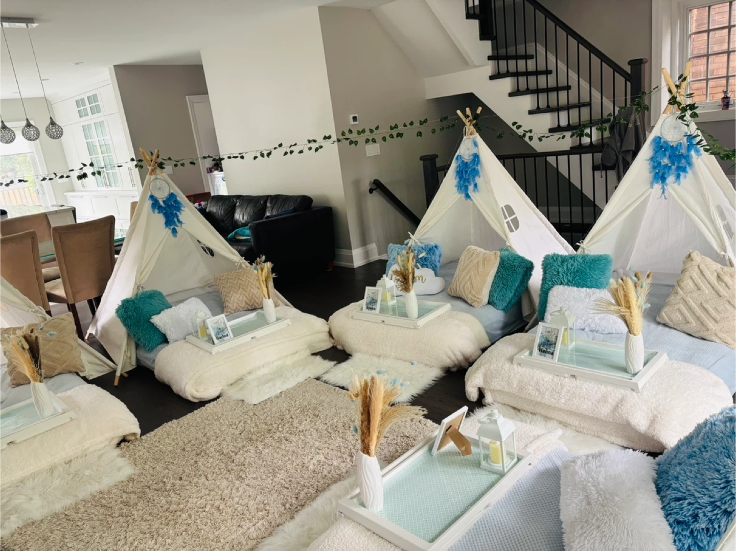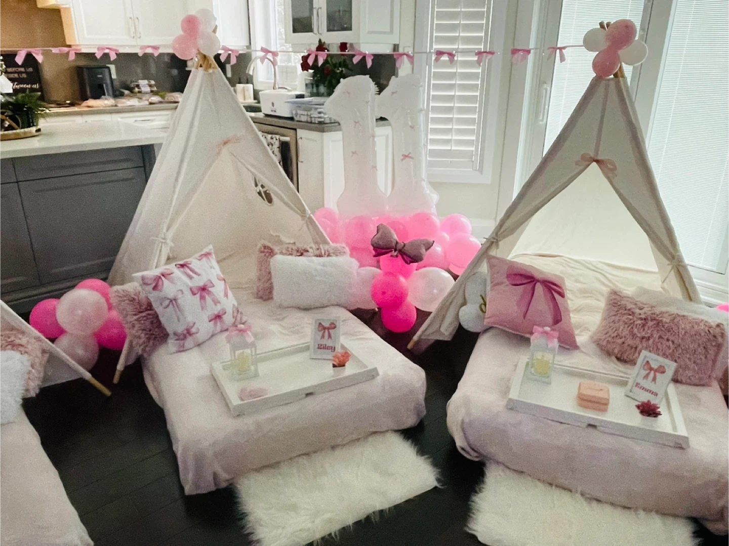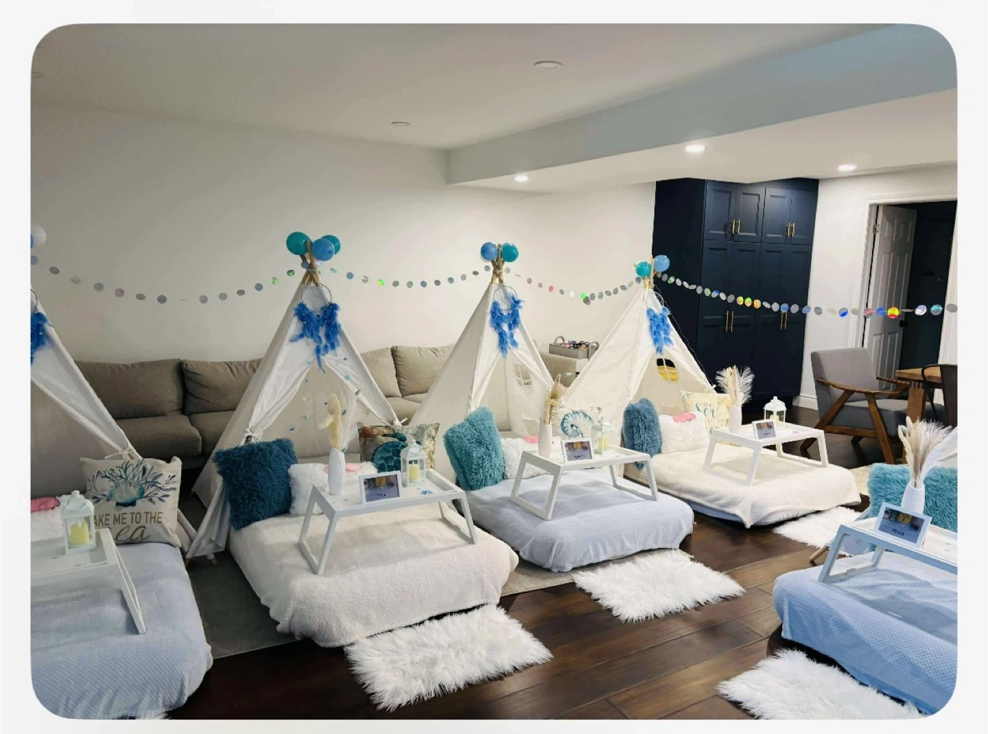 All packages include: • Tent • Twin Size Air Mattress • Fitted Sheets • Blankets • Decorative Pillows • Accessories: Banners, Garland, Balloons (2 Balloons per tent) • Fairy Lights per Tent • Personalized Name Post per Tent • Bed Tray • Battery Operated Lantern • Additional items and themes are available upon request **Price is subject to change and based on package size.