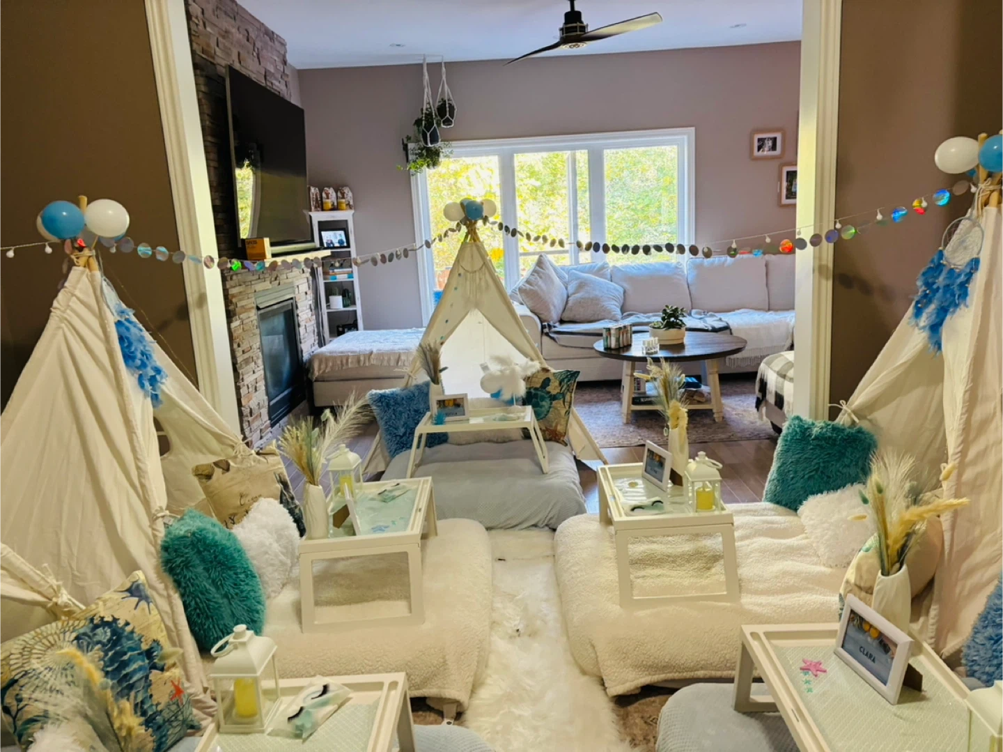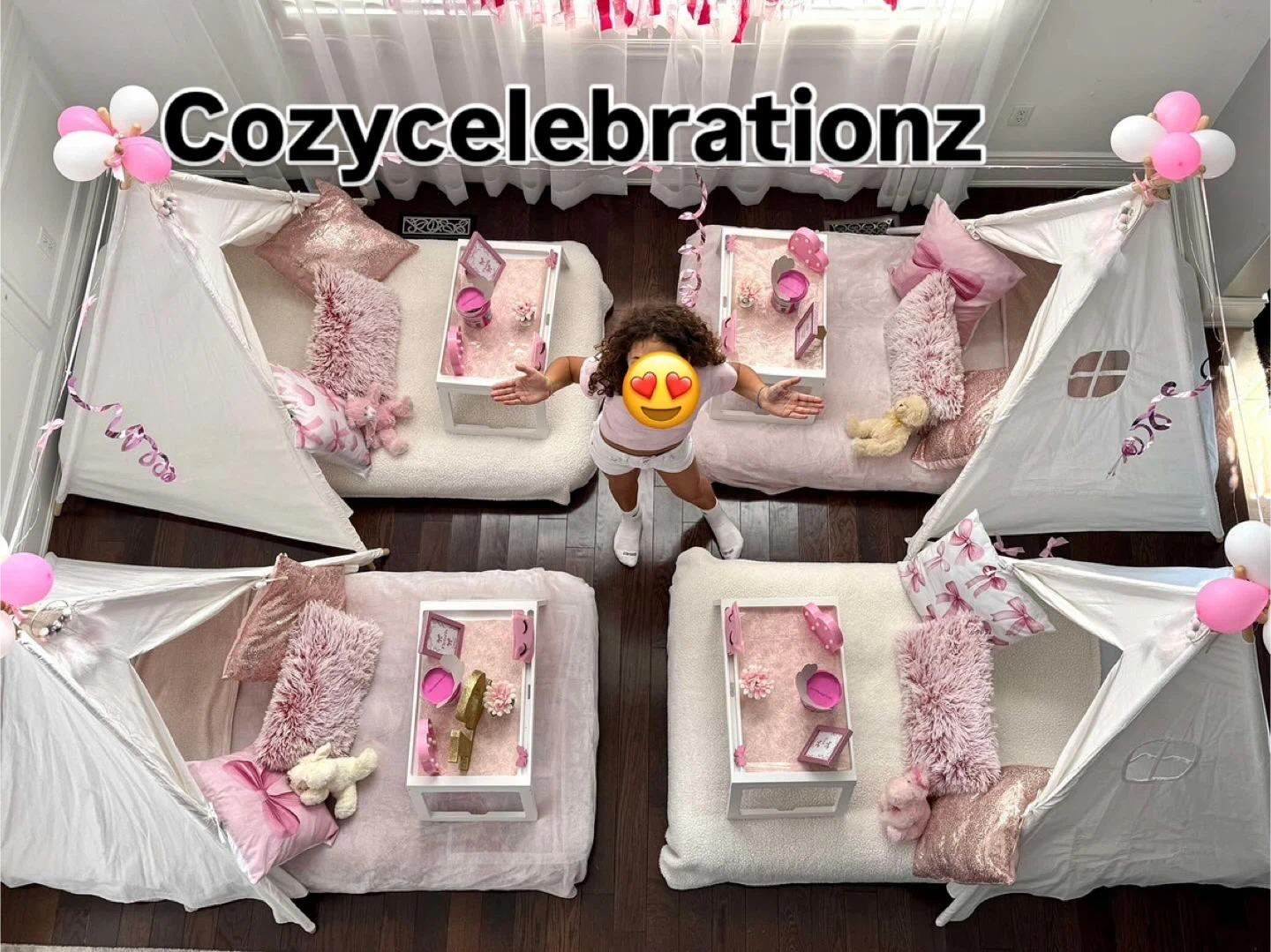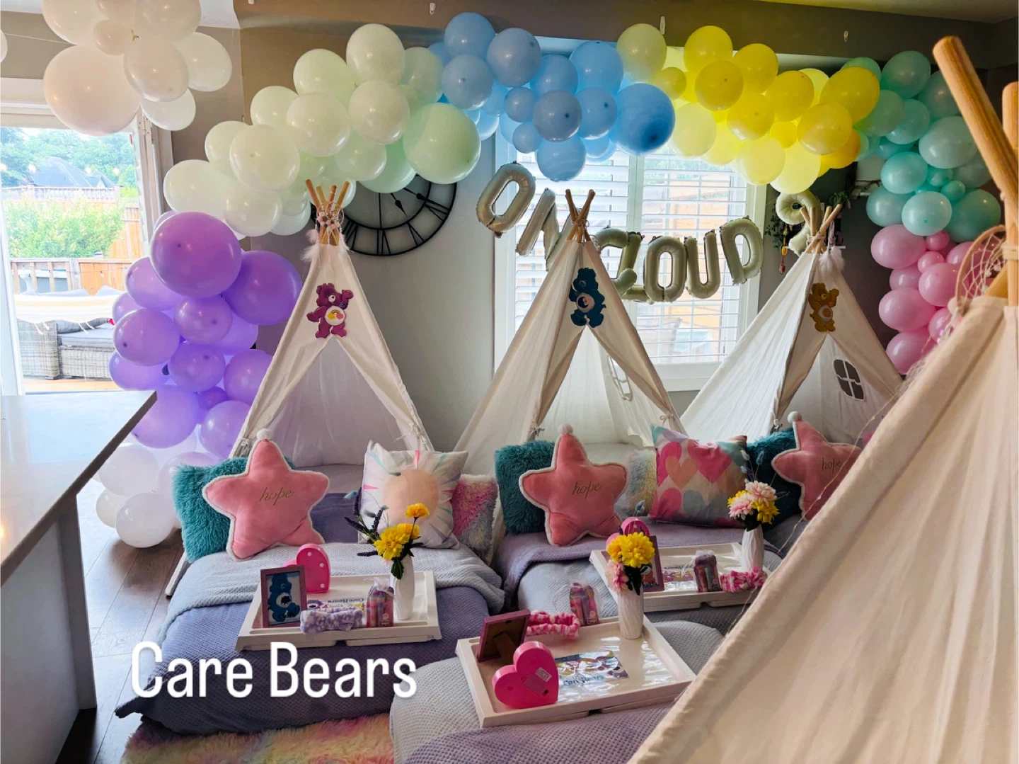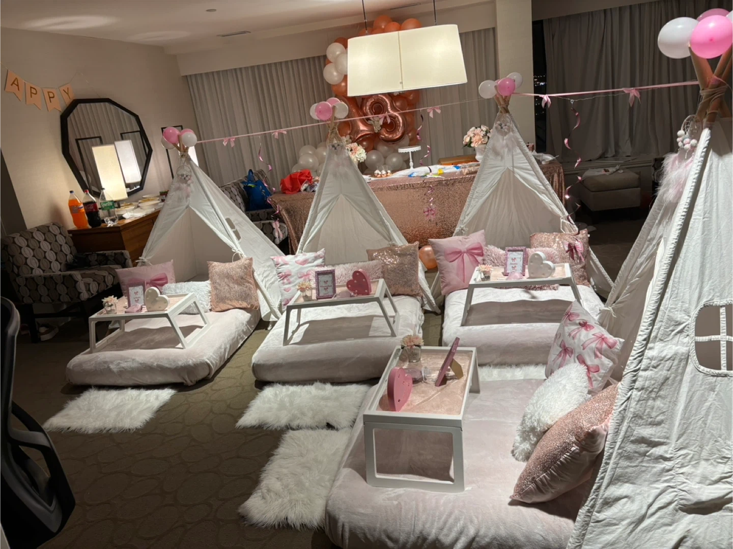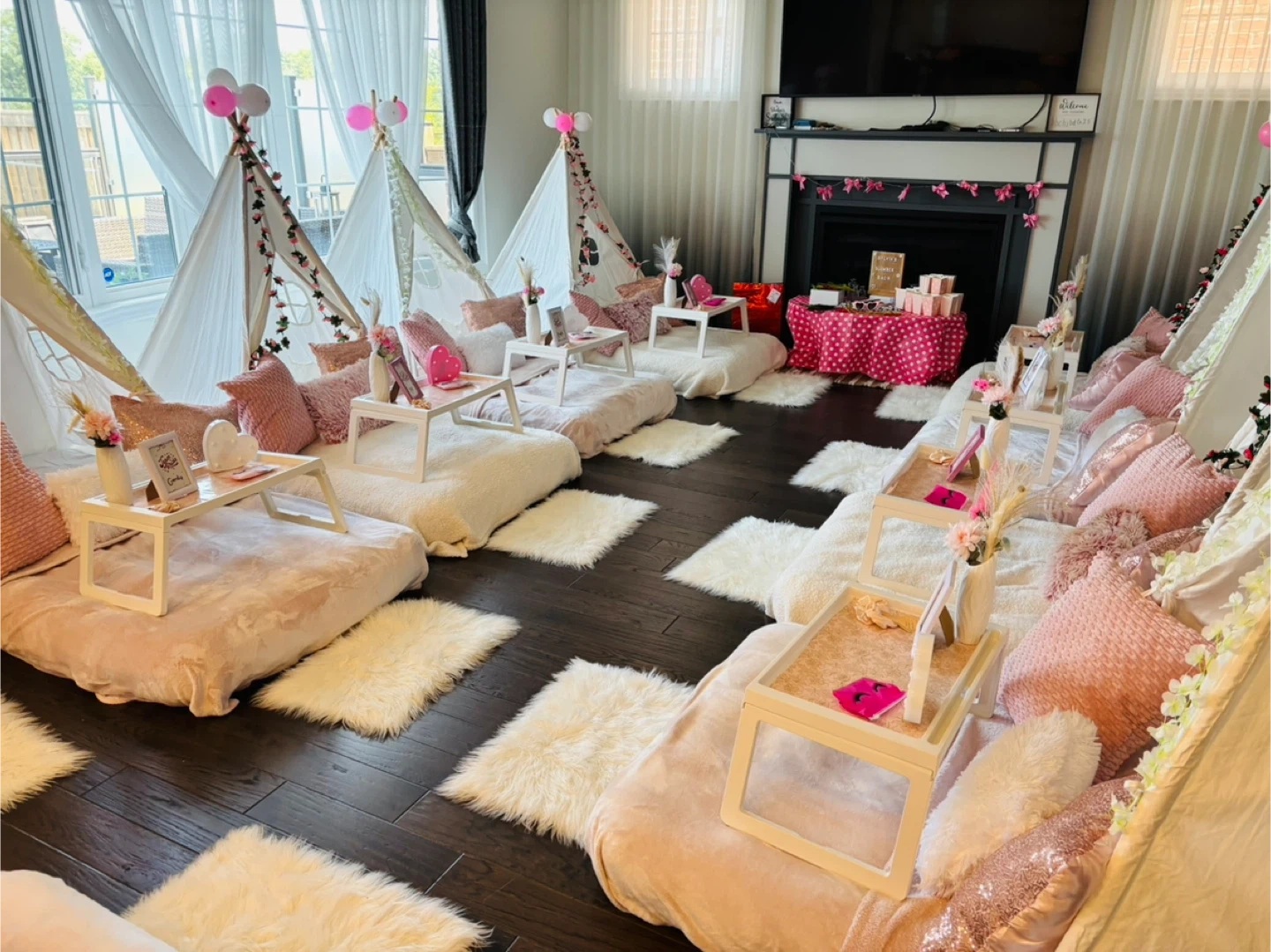All packages include: • Tent • Twin Size Air Mattress • Fitted Sheets • Blankets • Decorative Pillows • Accessories: Banners, Garland, Balloons (2 Balloons per tent) • Fairy Lights per Tent • Personalized Name Post per Tent • Bed Tray • Battery Operated Lantern • Additional items and themes are available upon request **Price is subject to change and based on package size.