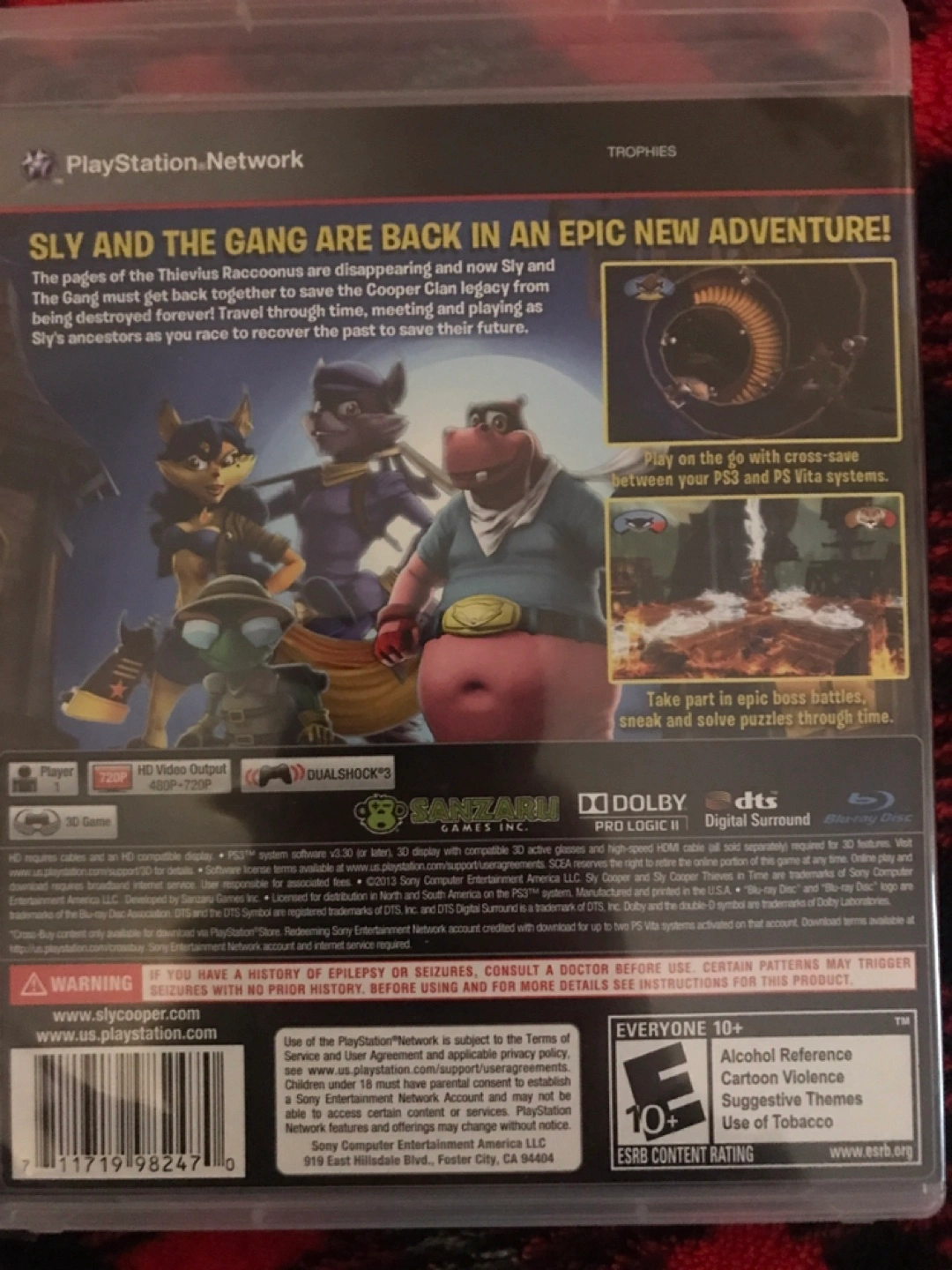 Selling a copy of Sly Cooper: Thieves in Time for the PlayStation 3 (PS3). This game is a 3D compatible title and is rated E10+ by ESRB. It also includes a downloadable version for your PS Vita system. Enjoy this epic adventure with Sly and the gang!