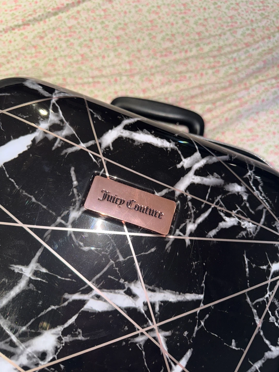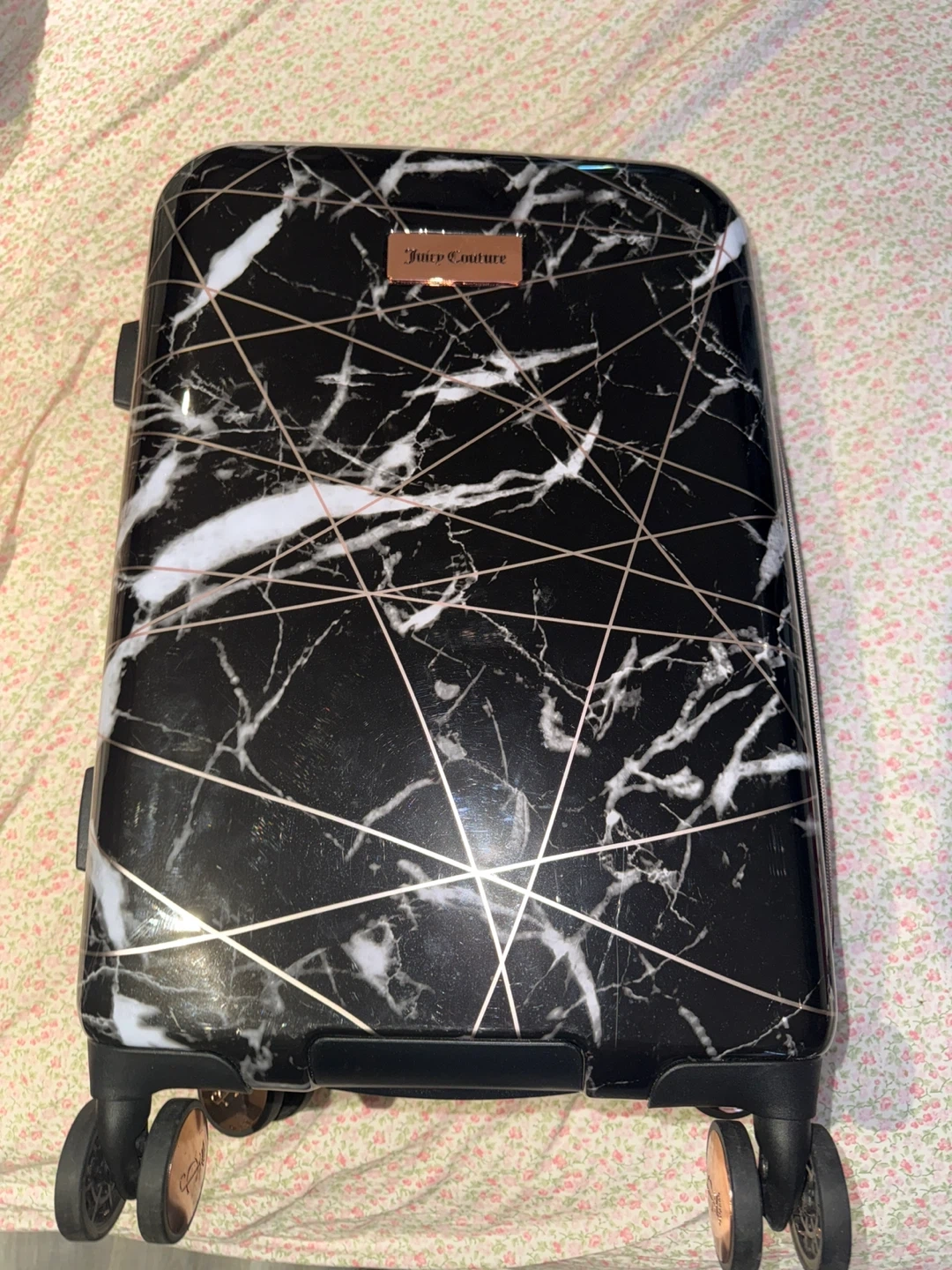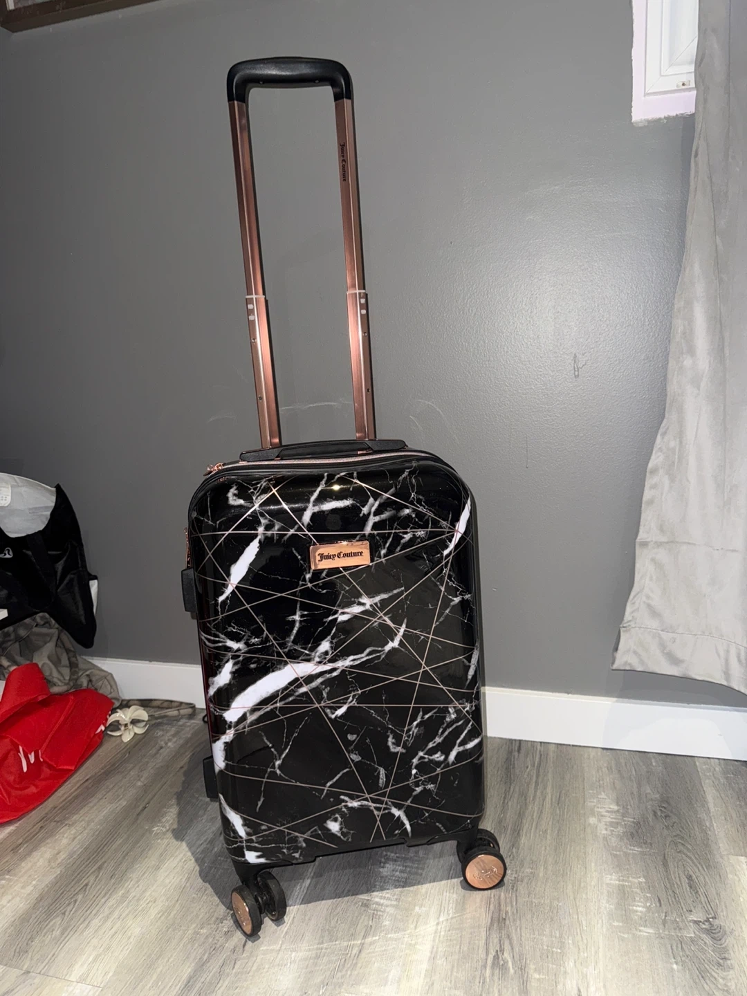 Black white and rose gold marble juicy couture suitcase, fits a lot and has a buckle inside to keep it intact as well as a big zippered pocket. Has levels to how tall you want the handle, wheels are good.