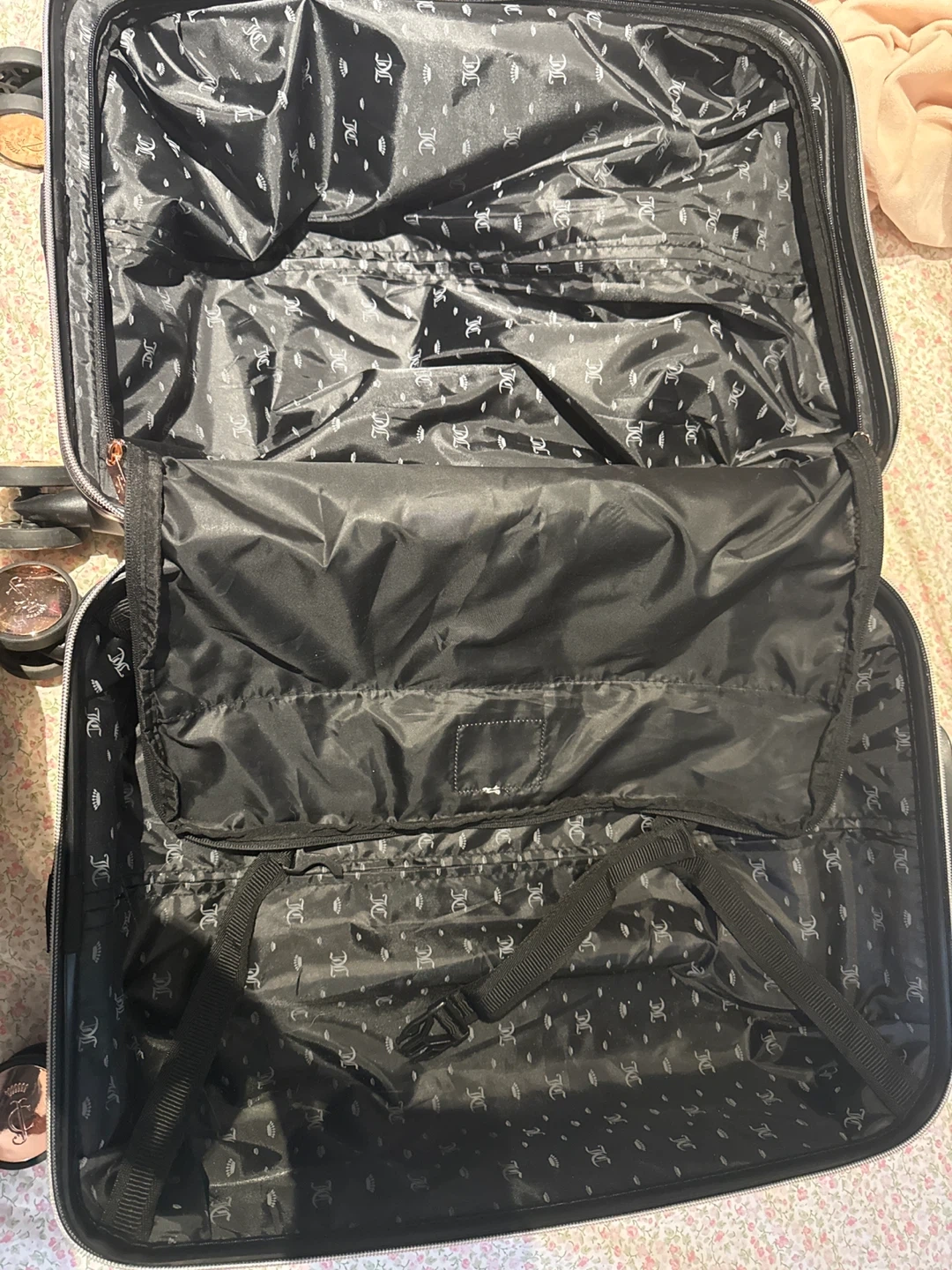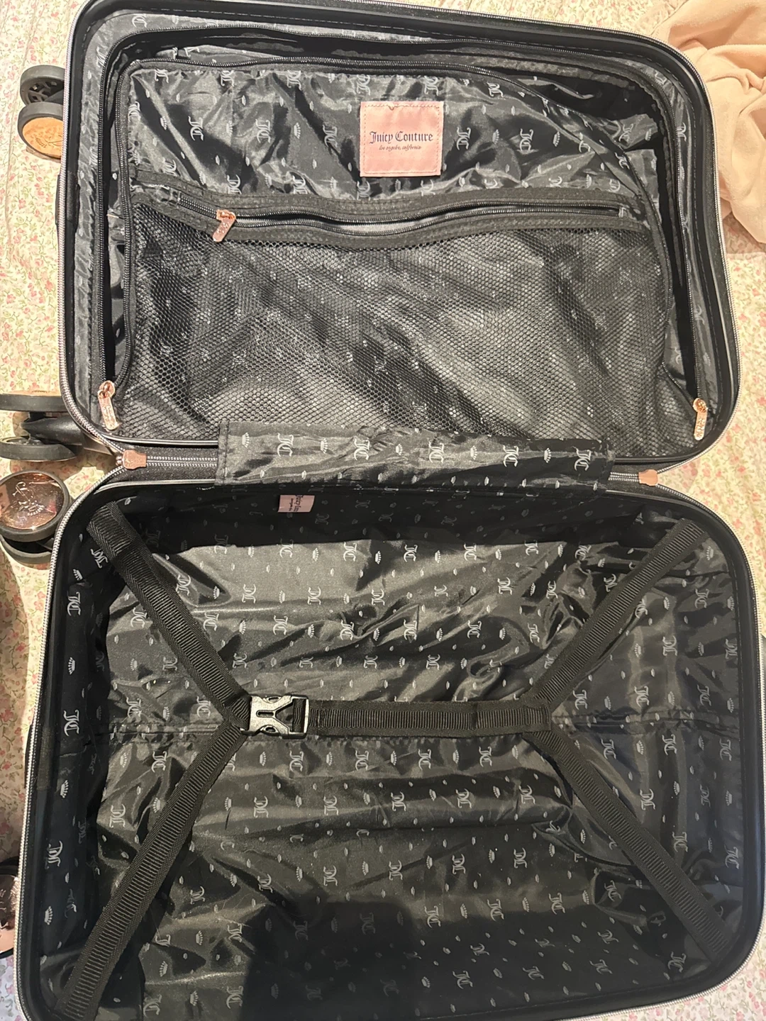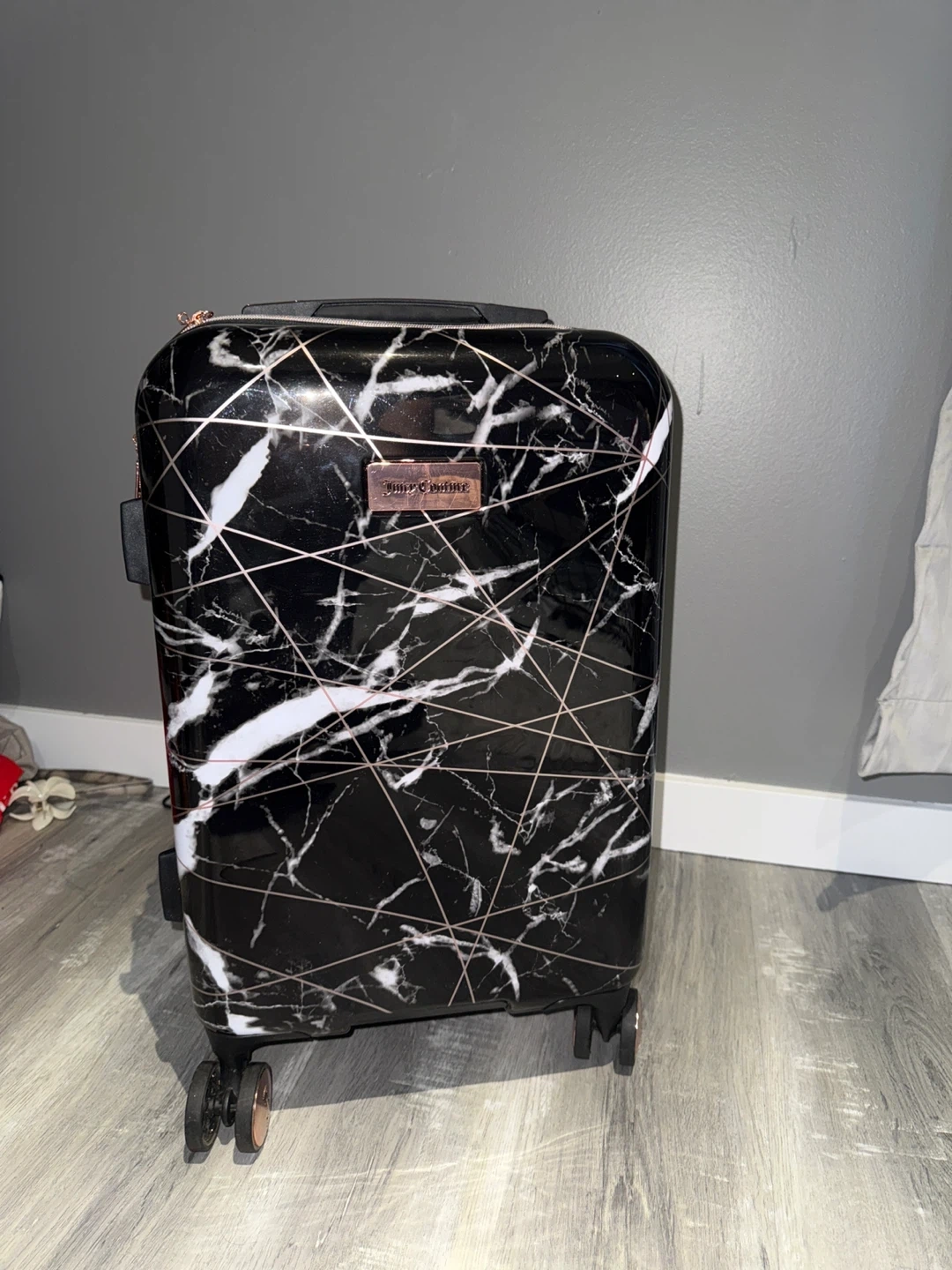 Black white and rose gold marble juicy couture suitcase, fits a lot and has a buckle inside to keep it intact as well as a big zippered pocket. Has levels to how tall you want the handle, wheels are good.