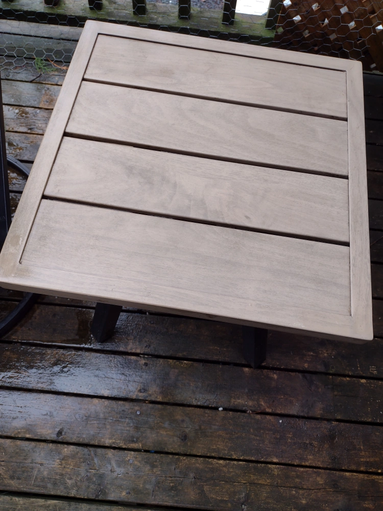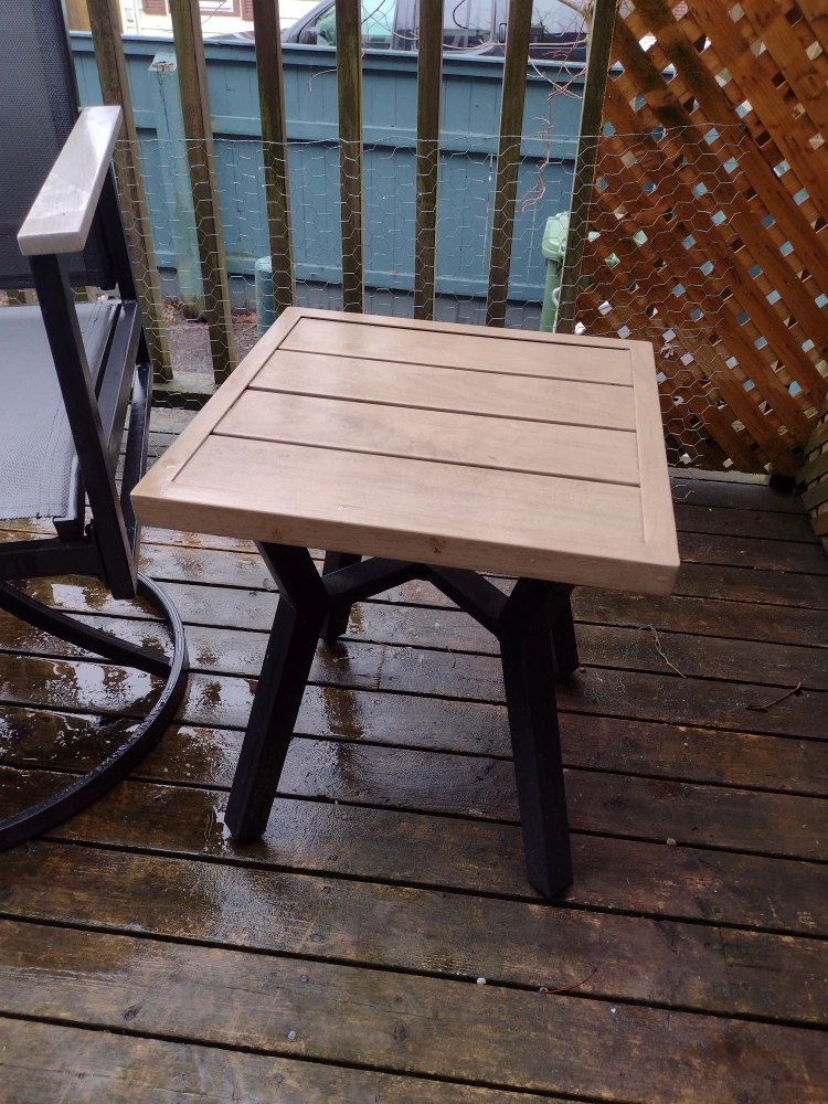 Small square patio table. Wooden grain (metal) top, black metal legs. Great for small spaces. Well maintained. Pickup only.