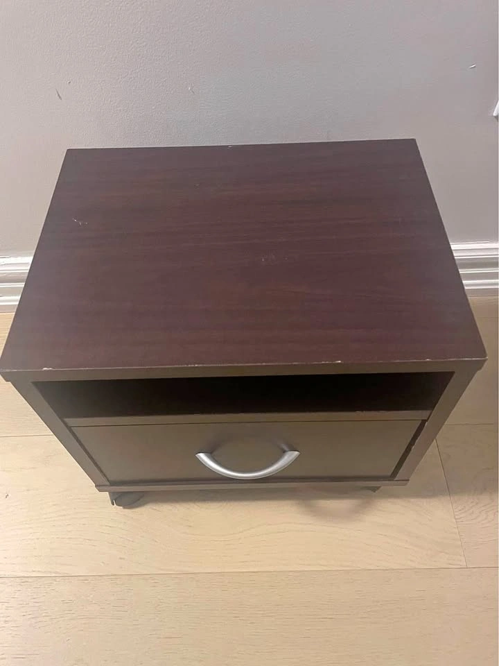 Sturdy dark wood laminate nightstand with one drawer and open shelf. Comes with wheels for easy movement. Good condition with light wear. Perfect for bedroom or office storage. Height: 13” Width: 15” Depth: 11”