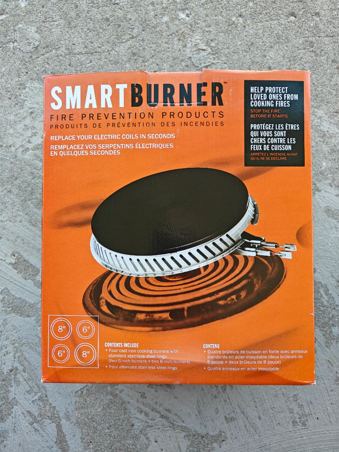 Selling a set of Smart Burner fire prevention burners. These burners are designed to replace your electric coils in seconds. The box includes four cast iron cooking burners with standard stainless steel rings (two 6-inch burners + two 8-inch burners) and four alternate stainless steel rings. Perfect for seniors wants freedom to cook with safety in mind! Amazon is selling $280