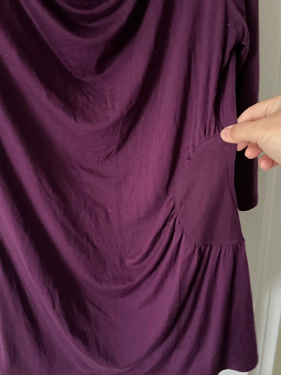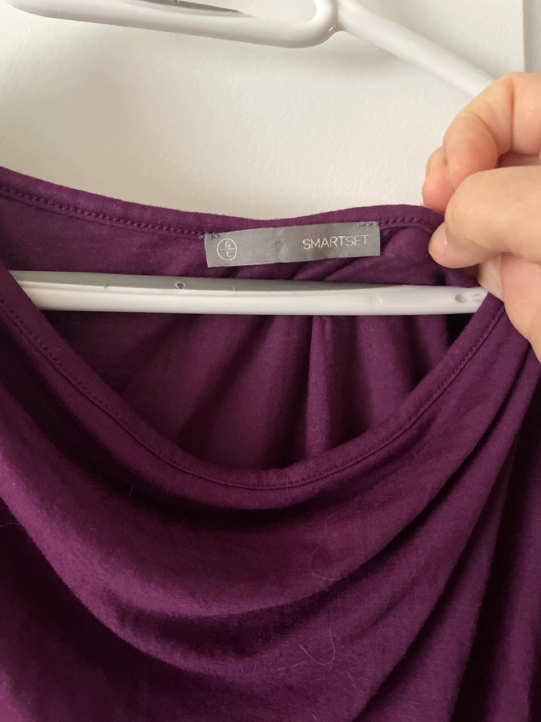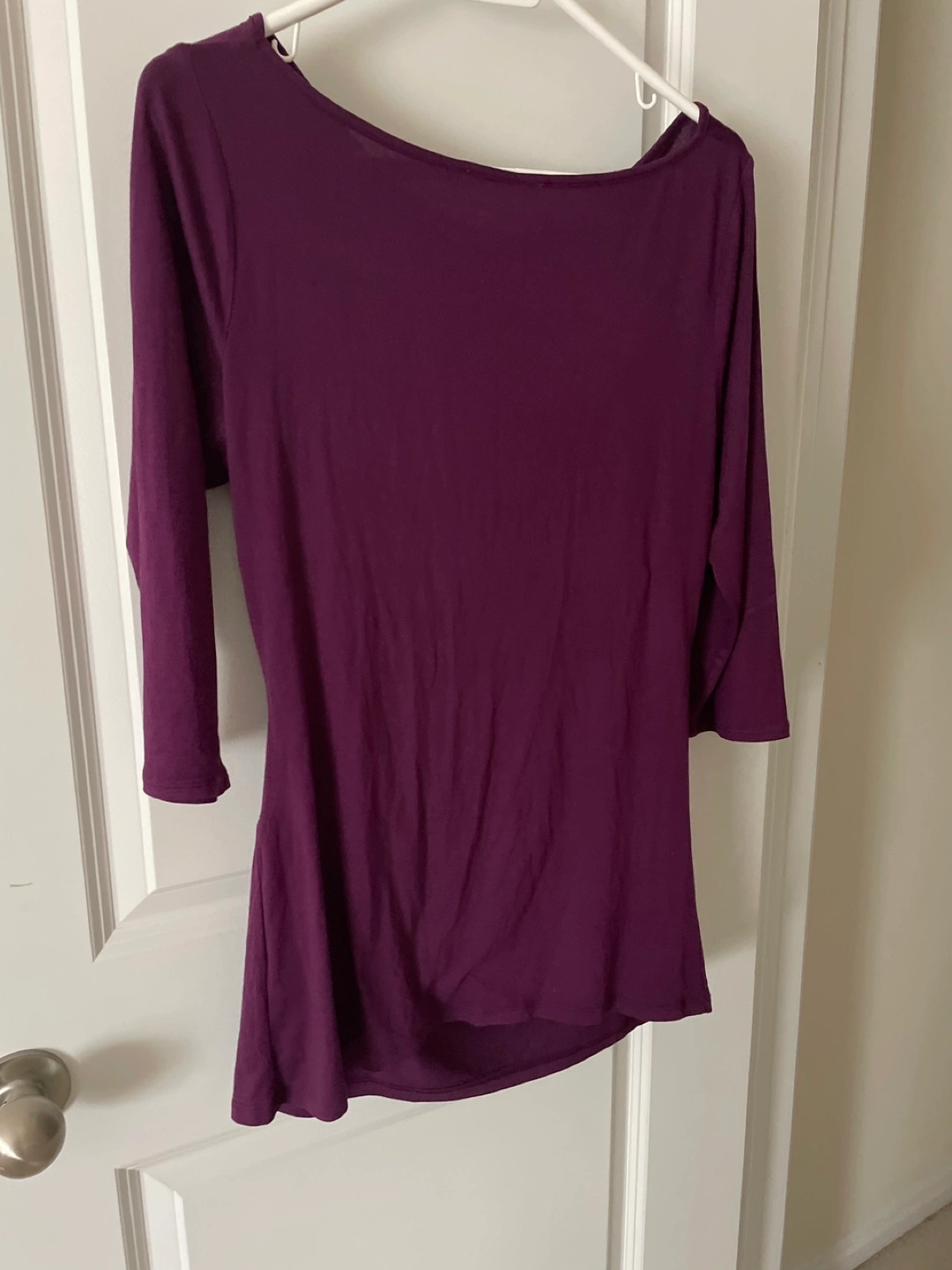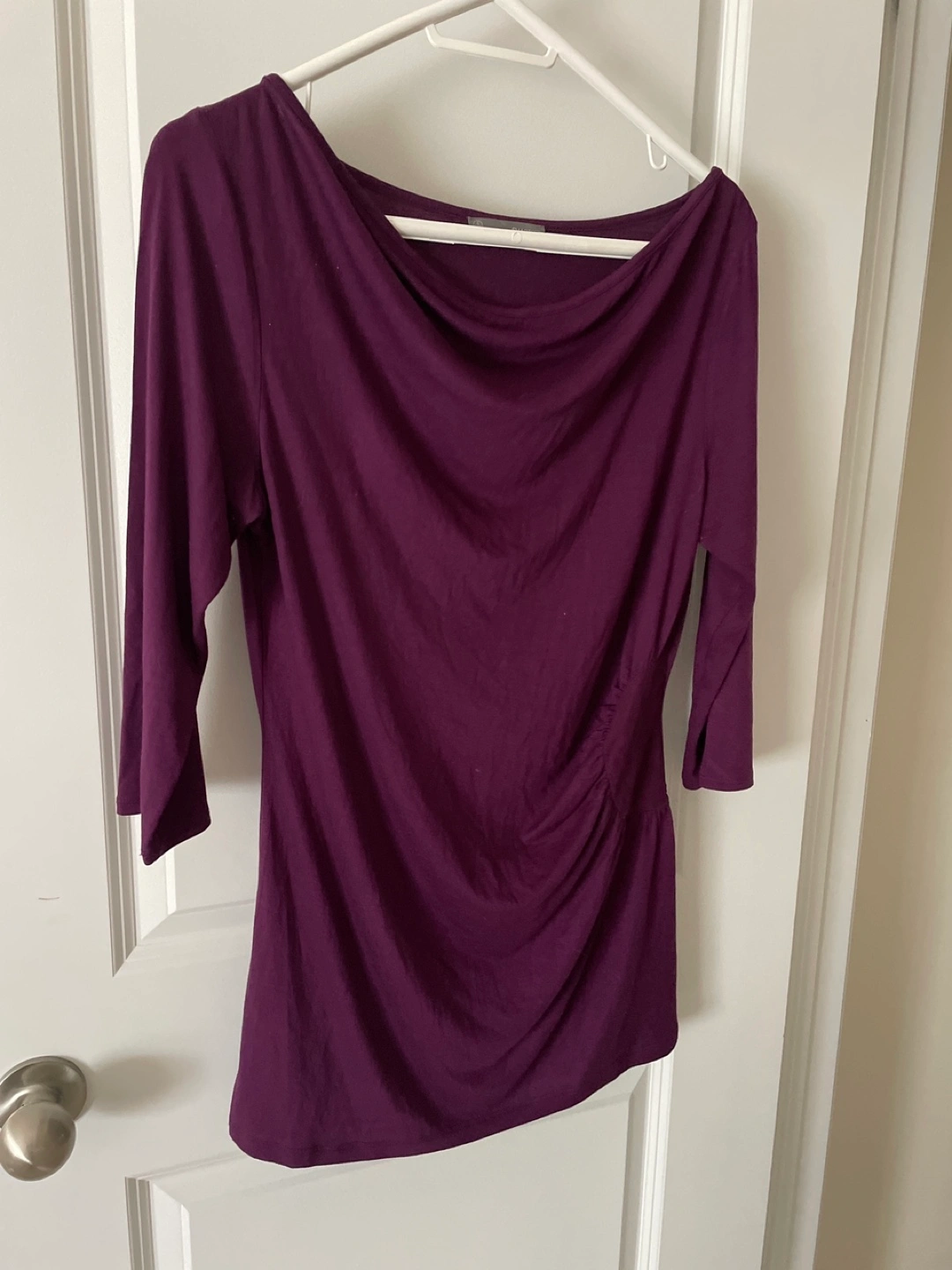 Women's SmartSet top. Size large. Purple colour. Three-quarter sleeves. Cowl neck. Slight ruching at the side.