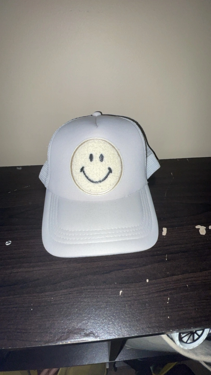 Selling a cute white trucker hat with a smiley face on the front. It's in great shape and ready for a new home!