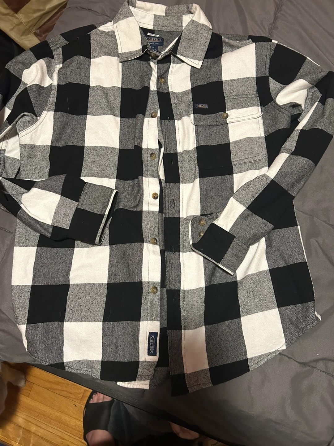 Selling a Smith's Workwear flannel shirt in a classic black and white buffalo plaid pattern! It's a size medium and features a button-down front and a chest pocket. Perfect for layering or wearing on its own!