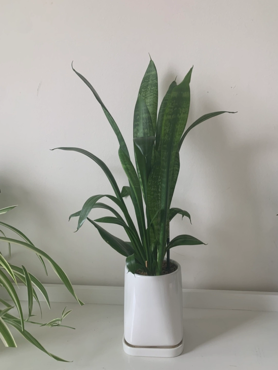 Healthy snake plant in a modern white ceramic pot. Great addition to any home décor. Easy to care for. Flawless and gift giving ready. From a smoke free and pet free home. Cash only. Not replying to AI suggested messages ex., Hi, I am interested, is it available etc. Serious inquiries only.