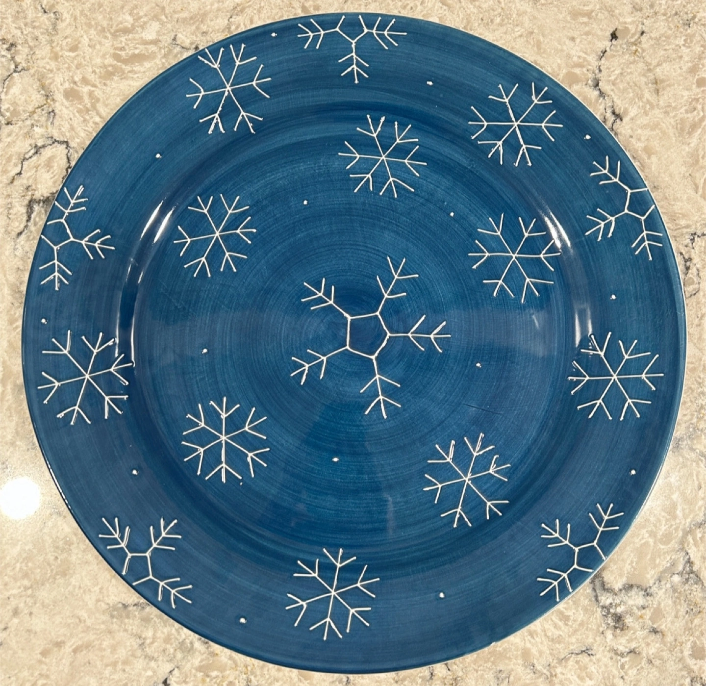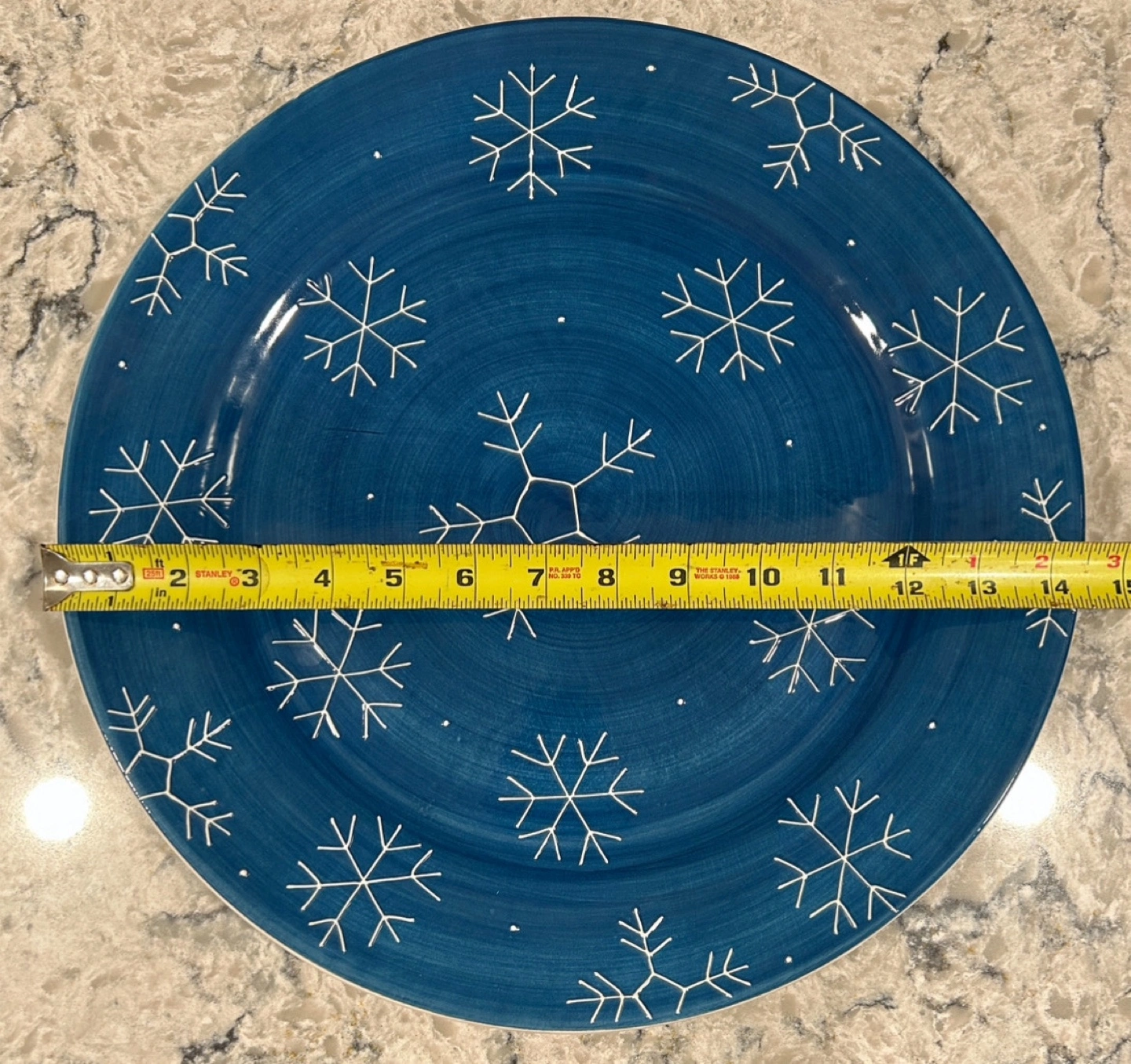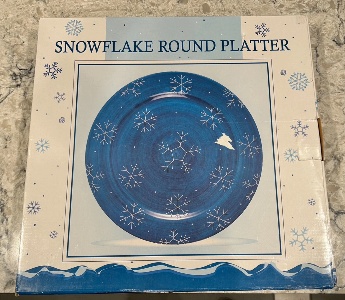 Snowflake Round Platter/Plate (approx 14.5 inch) Excellent condition only came out at Christmas to be displayed in the china cabinet behind glass otherwise was stored in the original box Dishwasher and microwave safe See other listings for more kitchen items and accessories
