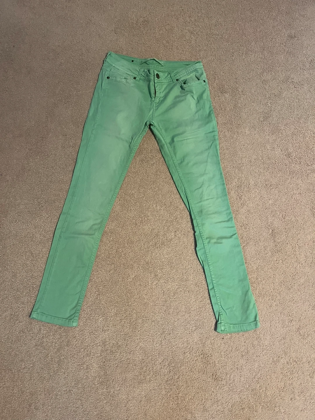 Selling a pair of SOHK brand jeans in a light green colour. The size is 34. They're in great condition and ready for a new home