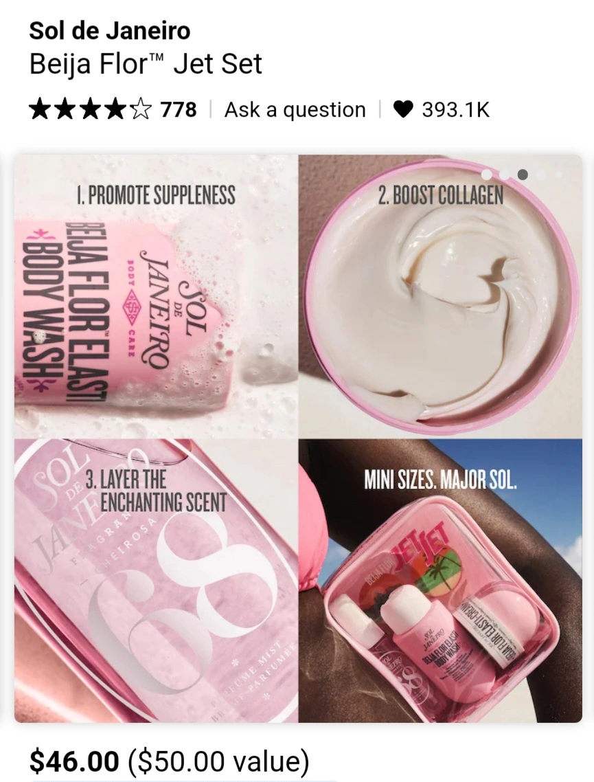 Includes all new from Sol de Janeiro Beija Flor (Cheirosa 68): - Beija Flor™ Renewing Body Wash 90ml - Beija Flor™ Elasti-Cream with Polypeptide and Squalane 25ml - Brazilian Crush Cheirosa ’68 Beija Flor™ Hair & Body Fragrance Mist 30ml Key Notes: Brazilian Jasmine, Pink Dragonfruit, Sheer Vanilla - Fragrance Description: In Brazil, one essential beauty secret is to be "cheirosa" (sheh-ro-zah), which means to always smell delicious. Vibrant and unexpected, this fruity-floral scent offers a transportive temptation through the abundant, sun-dappled gardens of Rio. This immersive scent is kissed with joy and always inviting. - Collagen-supporting body routine featuring the bright Cheirosa ’68 scent. Similar set retails for $51.98 ($46+ tax). *If the post is Active, it’s Available* Price is firm. --> See DT location below for meet-up, walking distance from Rogers centre.