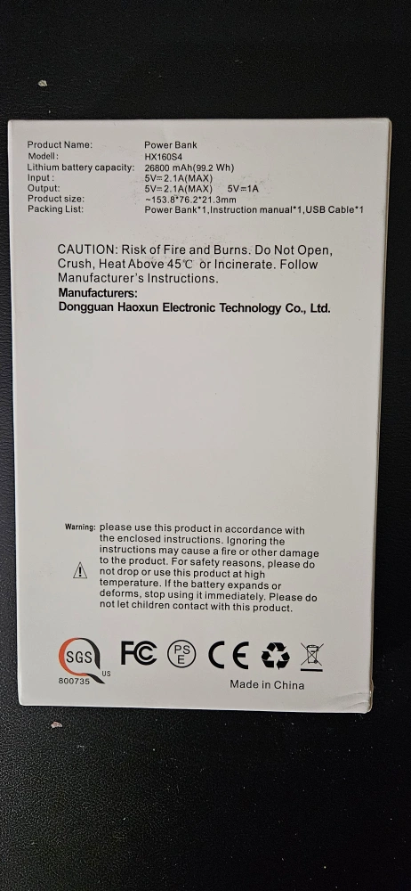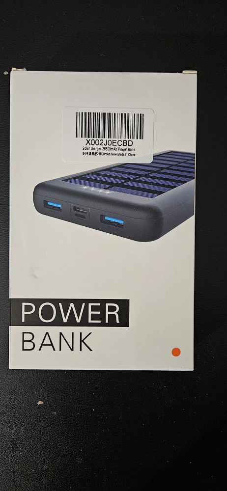 Selling a solar charger power bank with 26800mAh capacity. It comes with an instruction manual and a USB cable. The product size is 153 x 75 x 18.3mm. It can output 5V-2.1A (MAX) and 5V=1A.