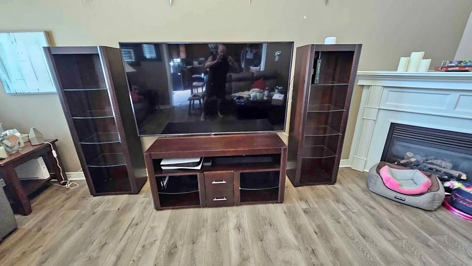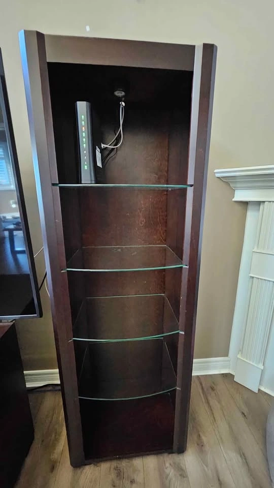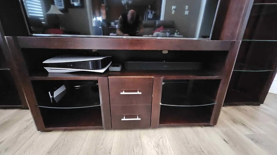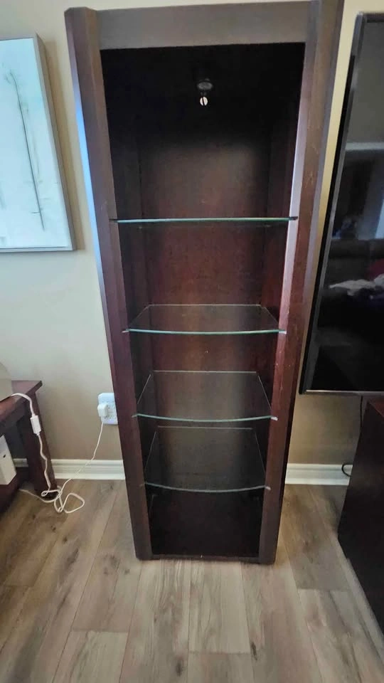 Solid wood 3 piece entertainment unit with removable glass shelves. Great condition with a few wear marks. Centre piece measures H 26.5 inches, width 53 1/4 inches, depth 25 inches Side displays H 63 inches, width 21 inches, depth 12 inches.