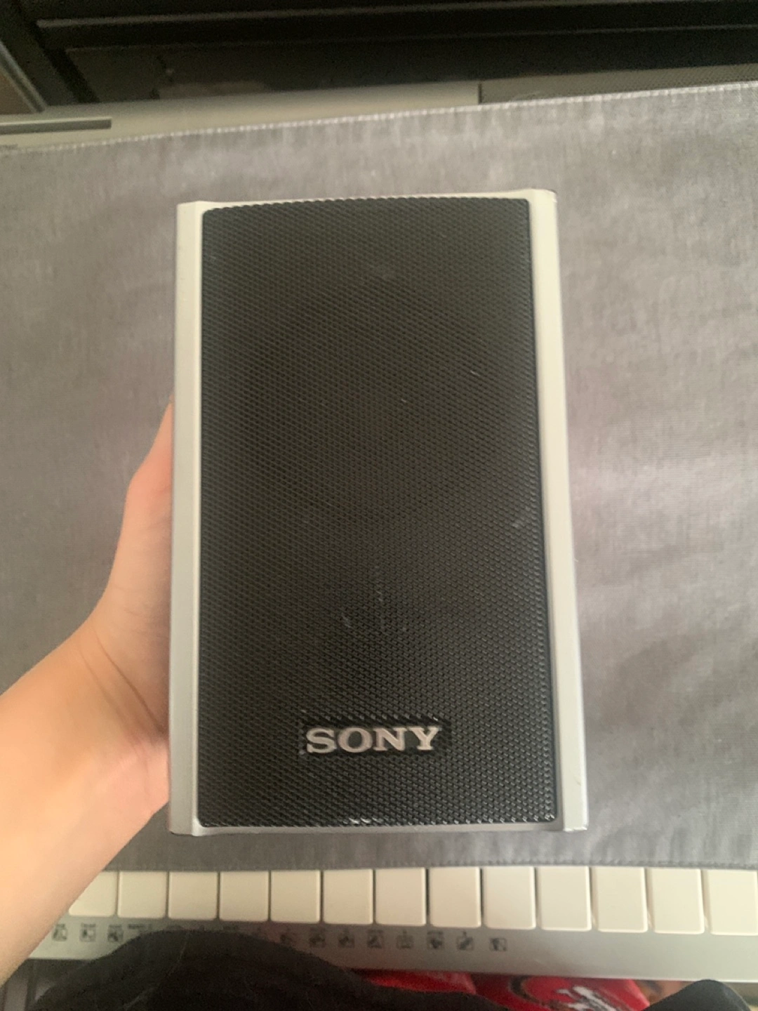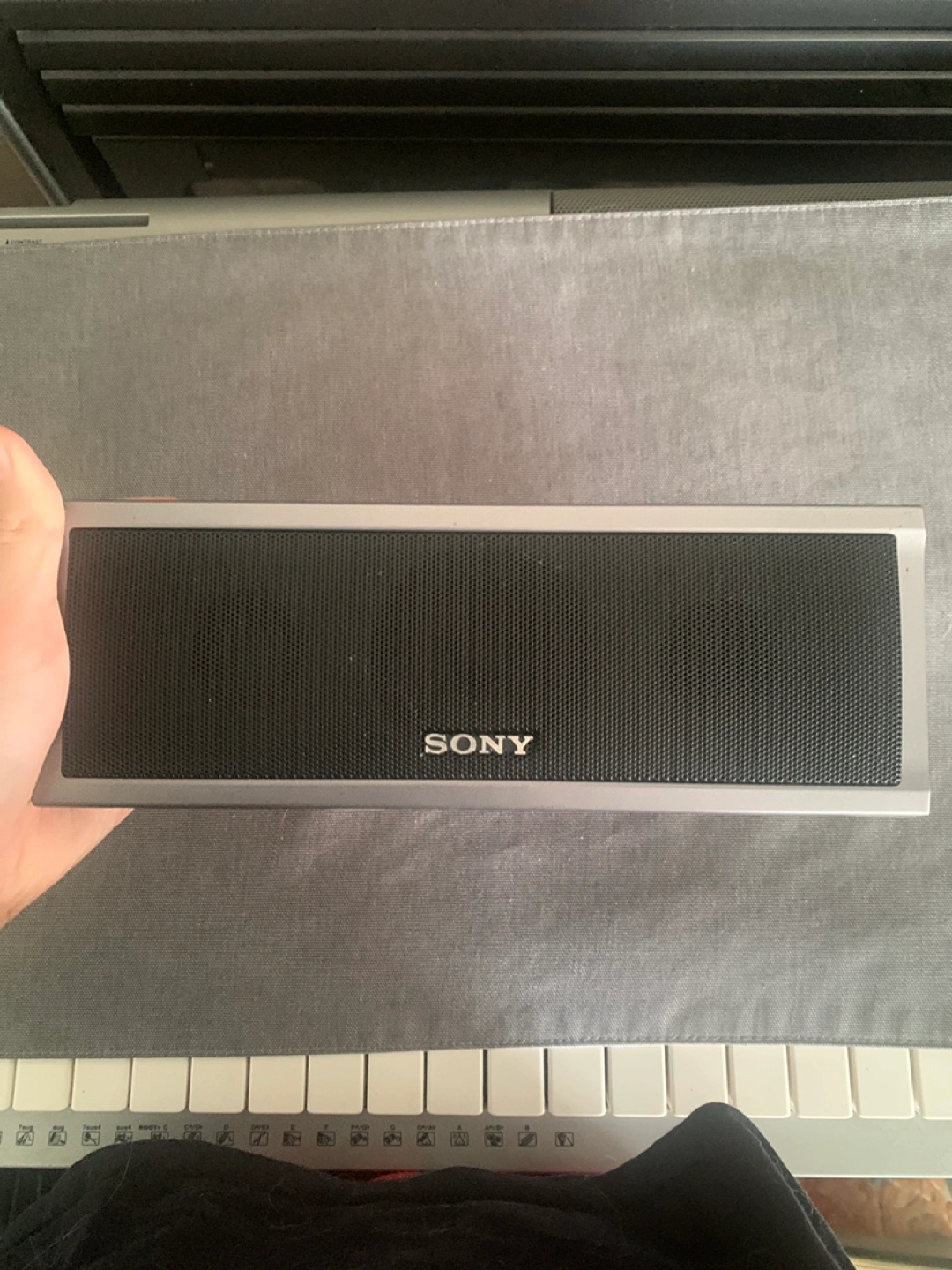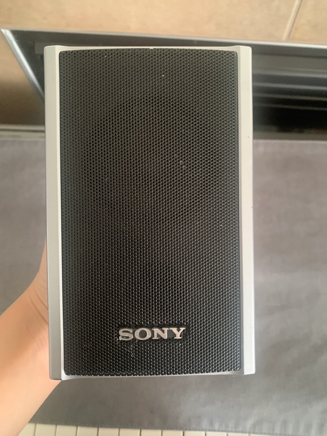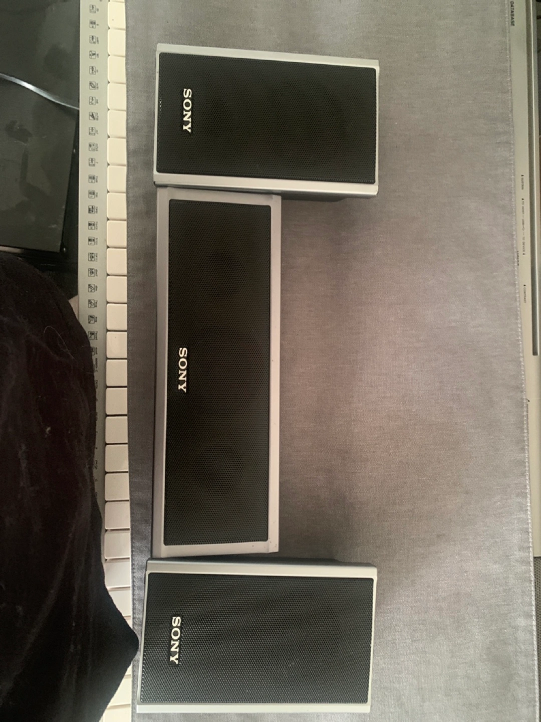 Silver and black speaker set. Includes two satellite speakers and a subwoofer. Great for computers or small setups.