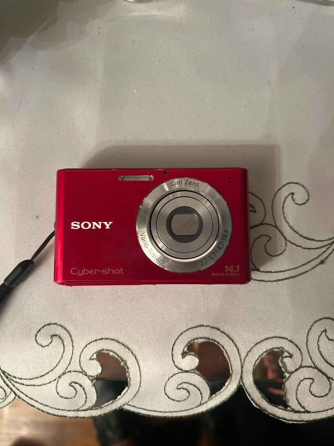 Selling a red Sony Cybershot digital camera. It's in great shape and ready for a new owner! It's a 14.1 mega pixel camera with a Carl Zeiss lens. Perfect for capturing memories! With battery no charger