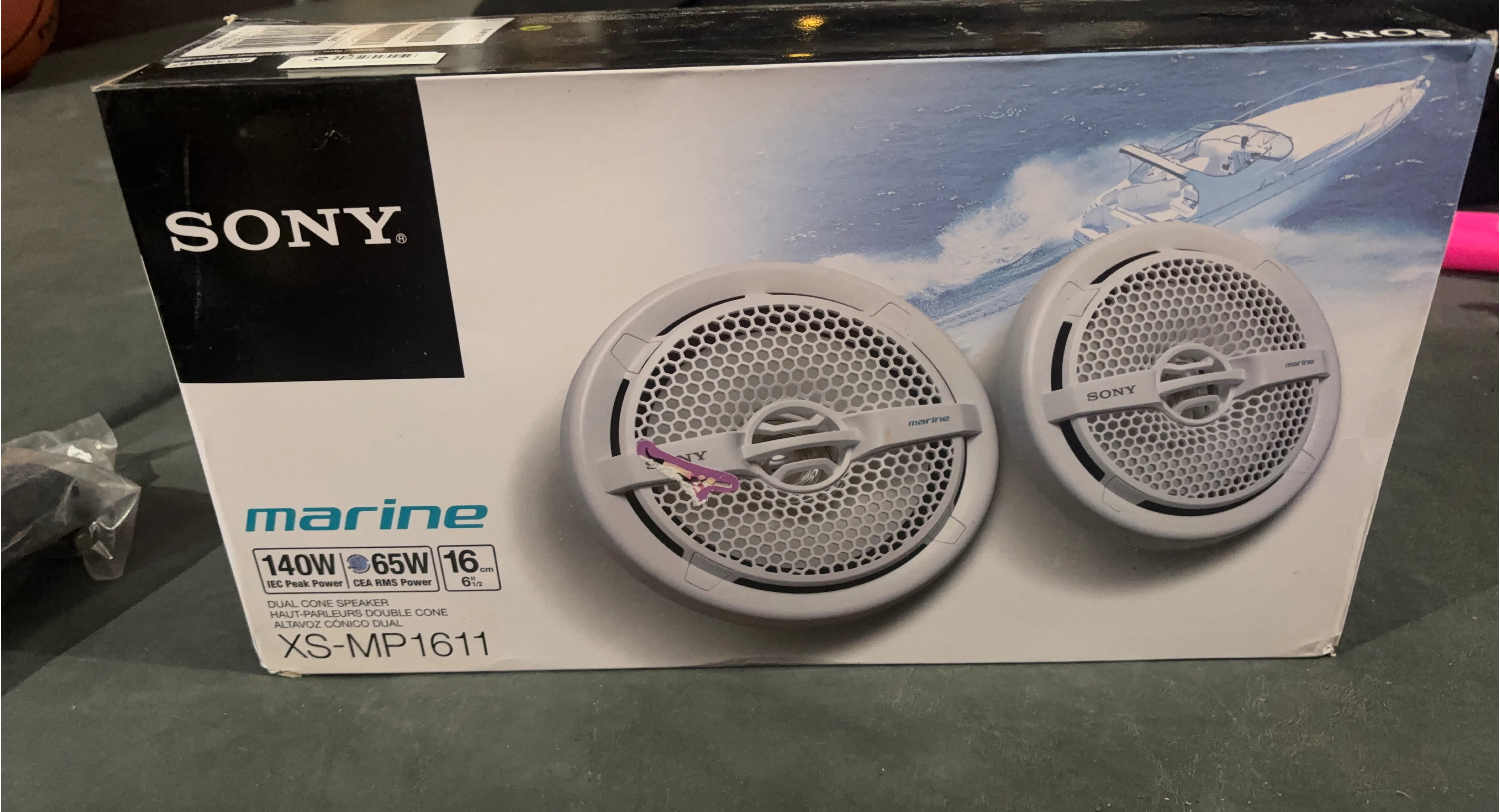 Selling a brand new pair of Sony XS-MP1611 marine speakers! These are 6.5" dual cone speakers, perfect for your boat or outdoor setup. They handle 140W peak power and 65W RMS power. The box is included!