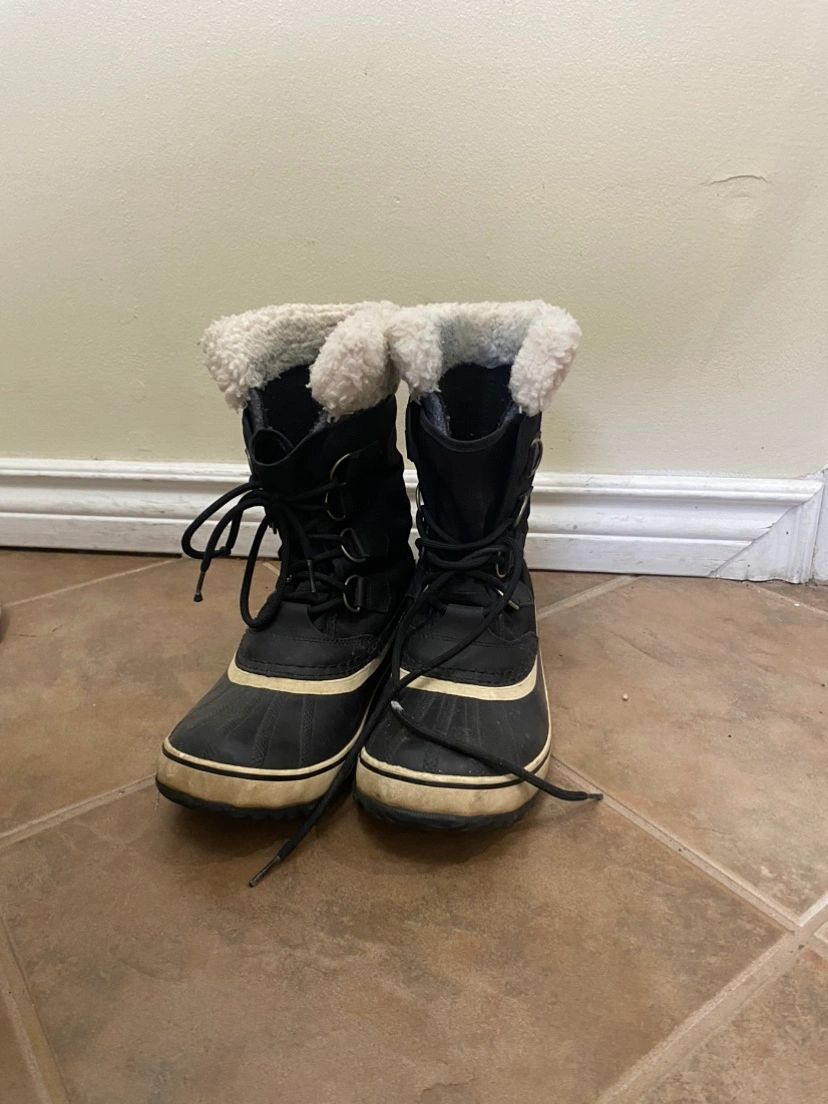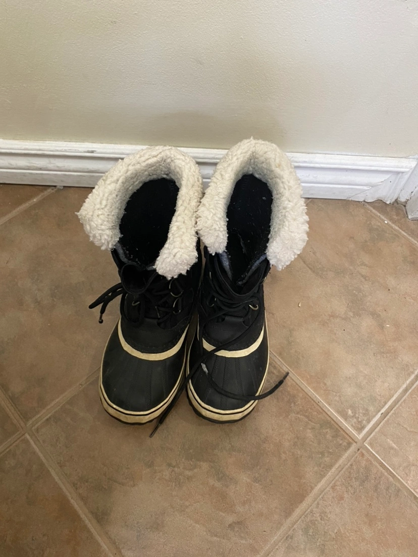 Black winter boots with a white trim and fur lining. They are lace-up boots. They are in good condition.