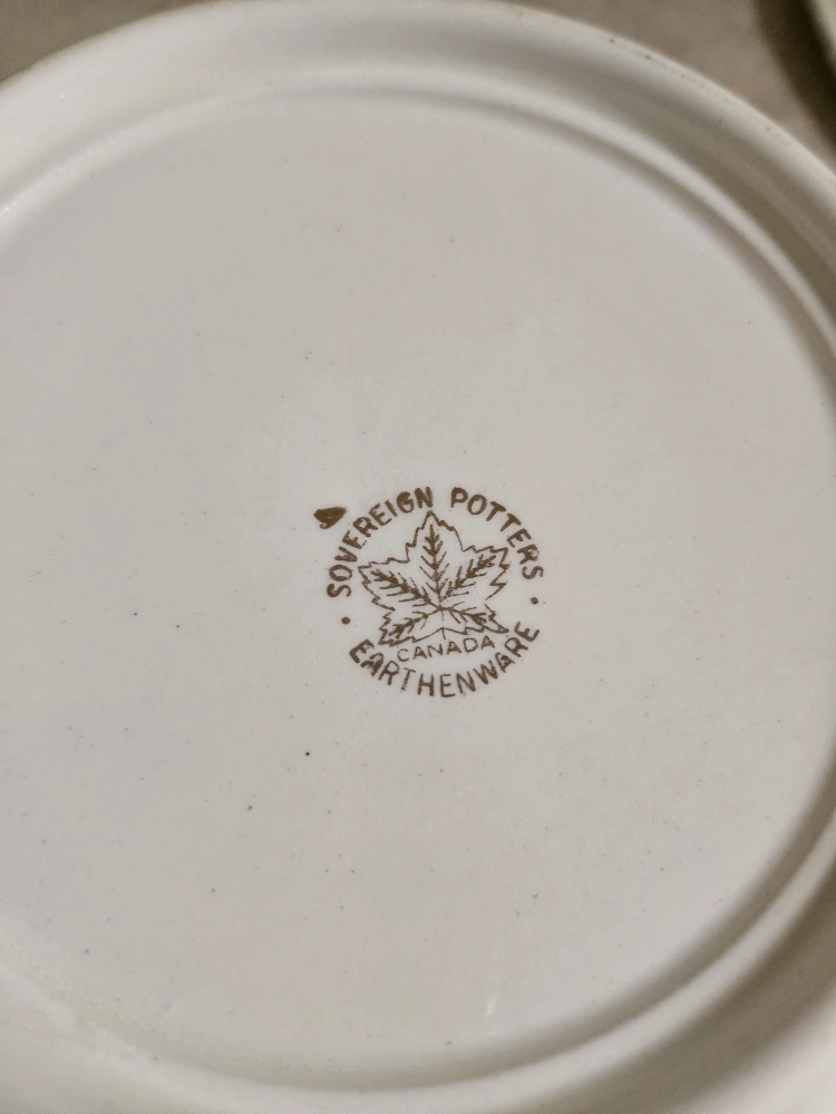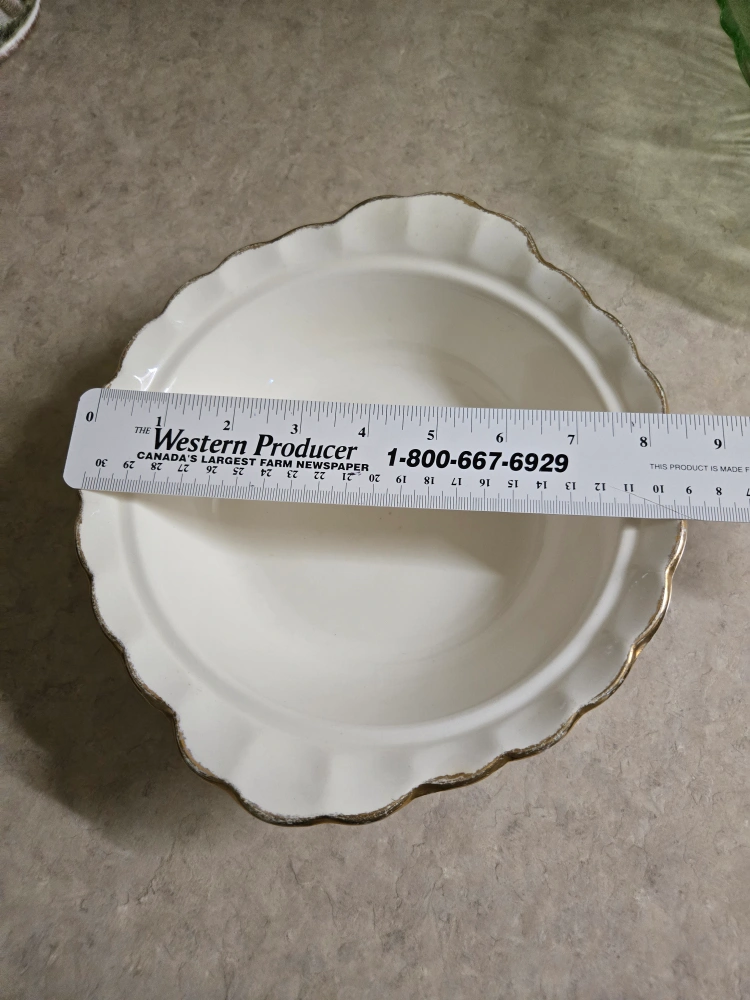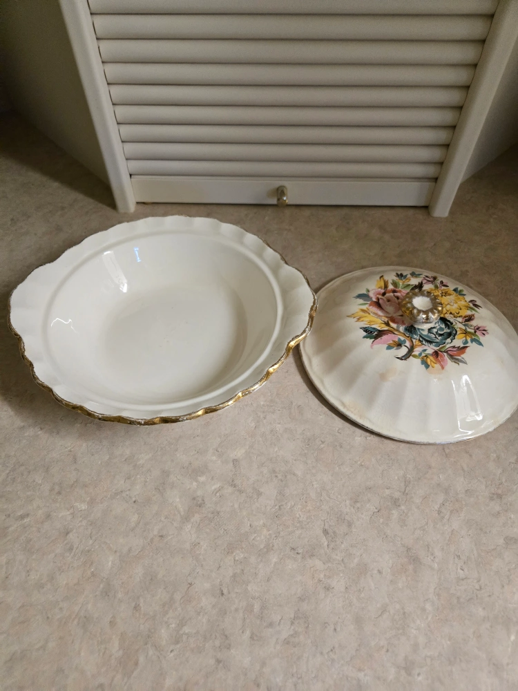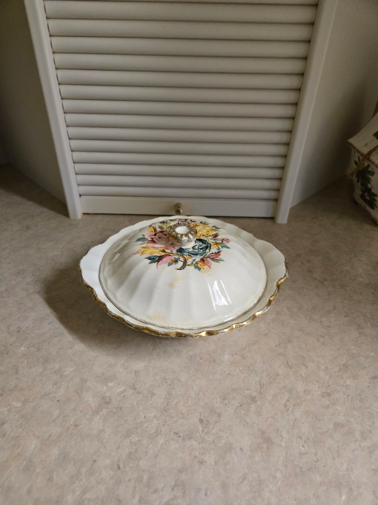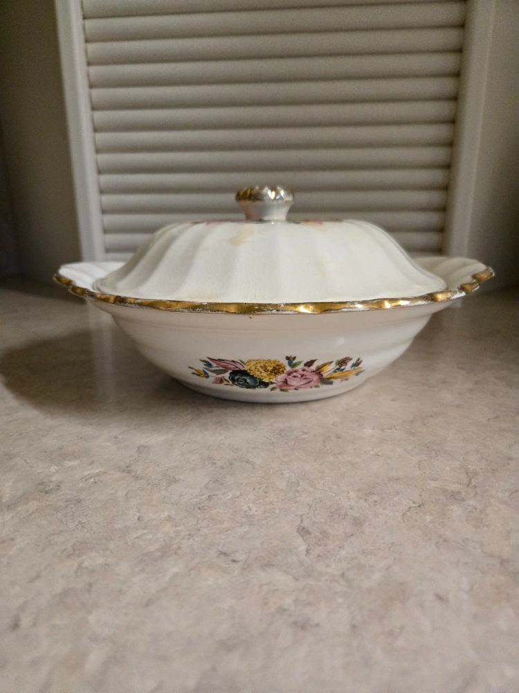 Selling a lovely Sovereign Potters Earthenware covered dish! It features a delicate floral pattern on the lid and a gold trim around the edges. The dish measures approximately 9 inches in diameter, perfect for serving your favourite dishes at your next gathering