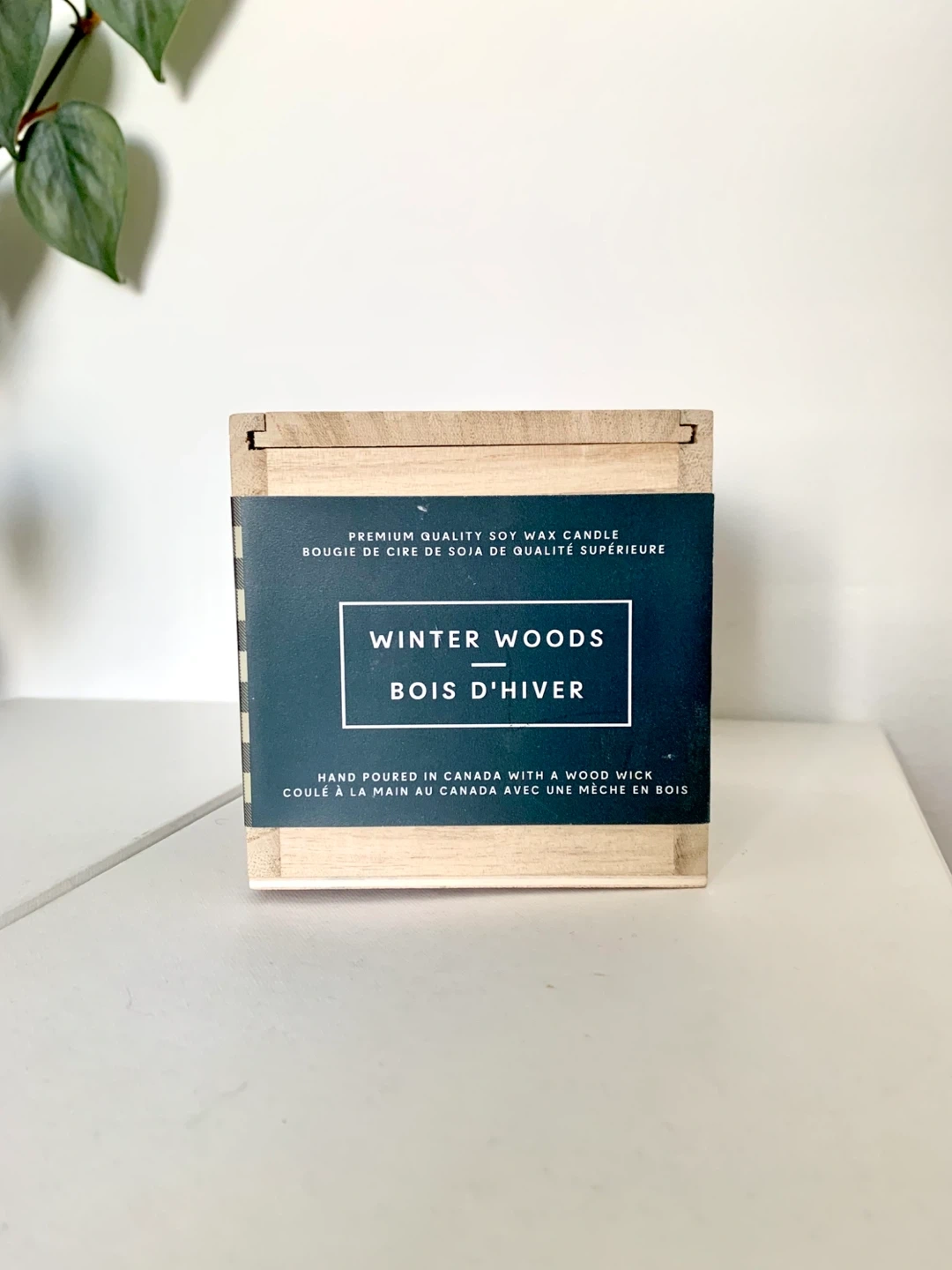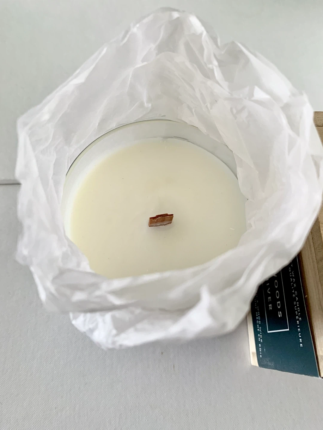 New and never used! Still wrapped in tissue, this candle has a wide wood wick and a pleasant “Winter Woods” (Norwegian Pine) scent. Comes with a wood container. The paper wrapper has small signs of wear. Retails for $24.98