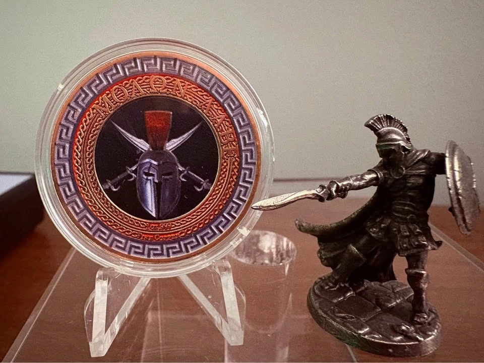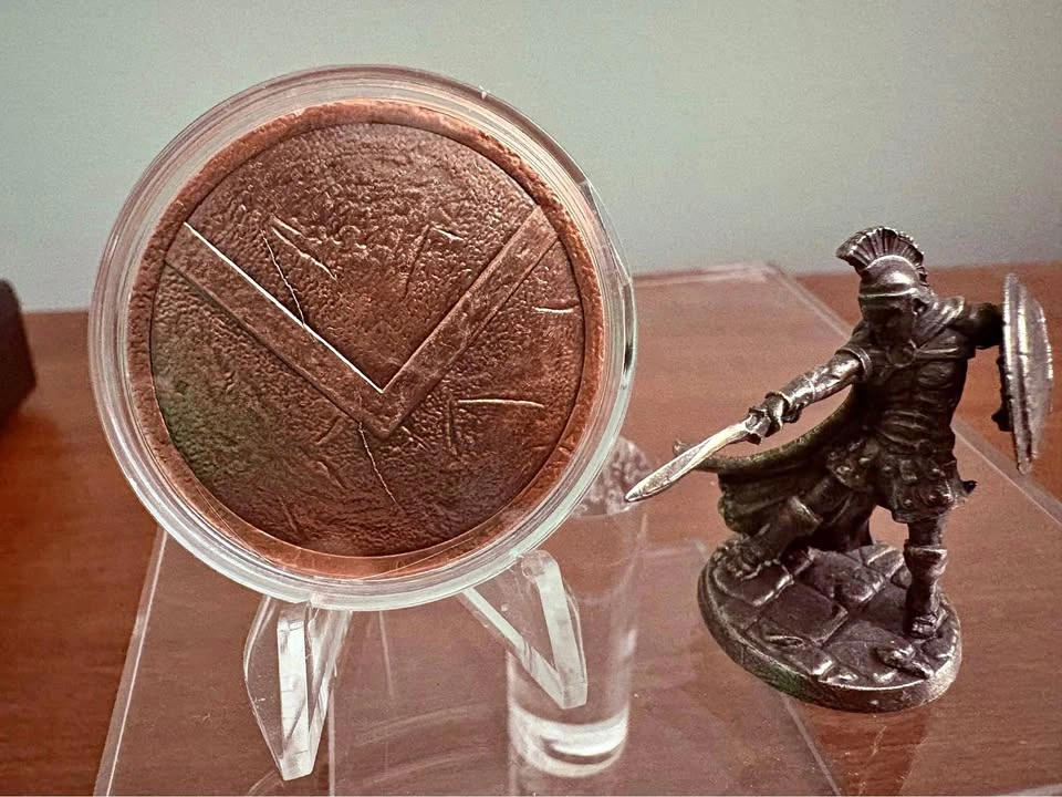 1 oz .999 fine/pure copper bullion Spartan shield round in capsule. Brand new and straight from the mint - made right here in Canada Your choice! Multiple available, choose Colorized or Antiqued finish on the reverse. $12 per round or take one of each for $20. These look awesome on display and would compliment any collection or make a great gift. Sigma verified, see photos. Obverse: Features the iconic, battle-scarred Spartan shield with a rugged antiqued finish. Reverse: Depicts the Greek phrase “Moaon Aabe” attributed to King Leonidas meaning “Come and take them” when it was demanded that his army relinquish their weapons. Also depicts weight of 1 oz and purity .999 fine copper. Can meet in public place in Maple Ridge.