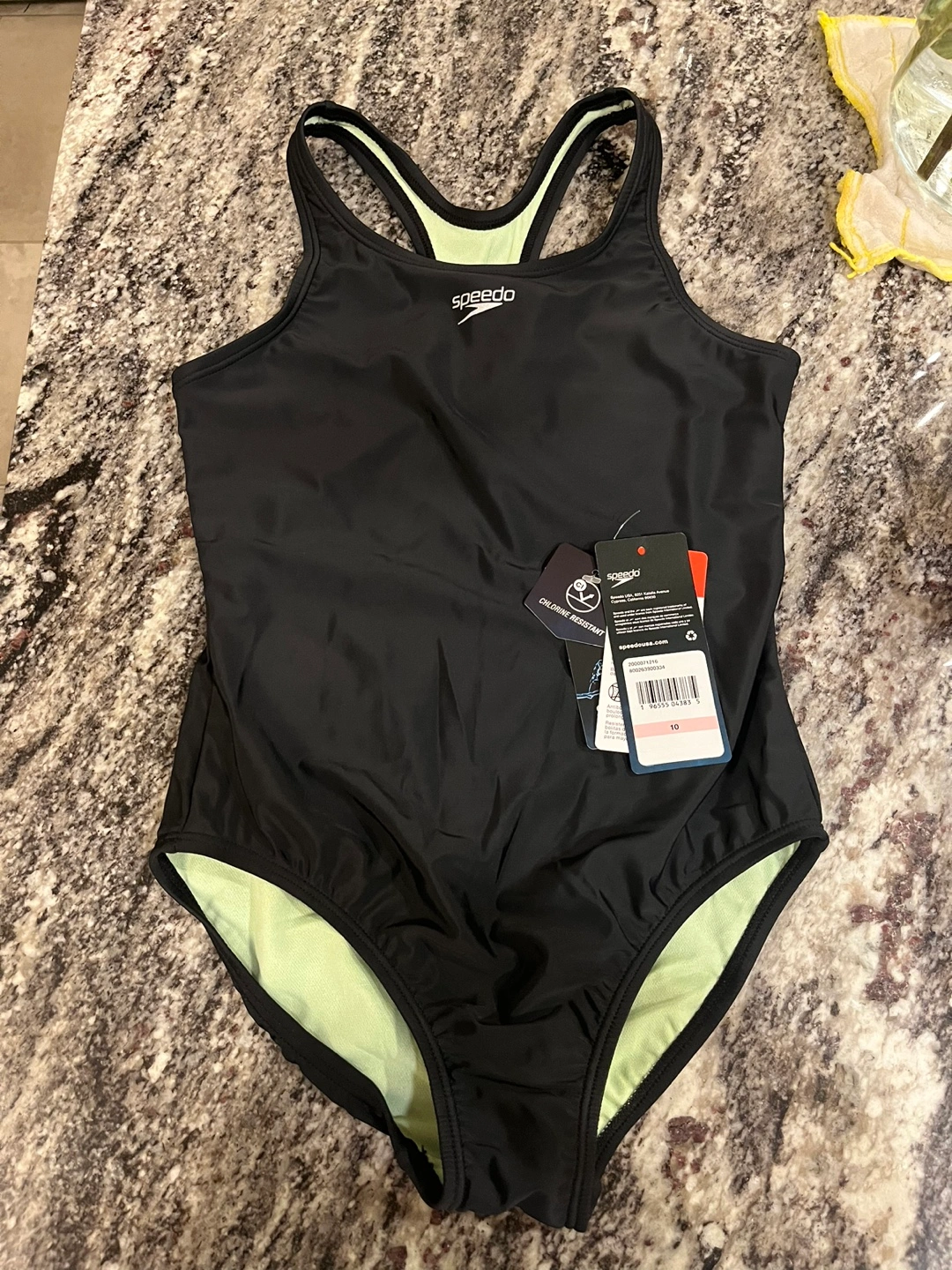 Black and green one piece swimsuit. Closed racerback style. Size 10. Never used, brought it wrong size. Cash payment and pick up only!