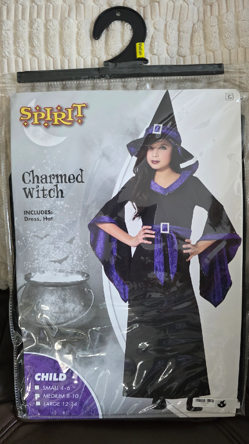 Selling a Spirit Charmed Witch costume for kids! It's a child's size medium (8-10) and includes both the dress and the hat. Perfect for Halloween or dress-up fun! (WORN ONCE)