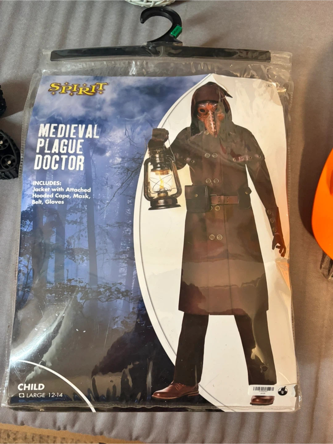 Selling a Spirit brand Medieval Plague Doctor costume for children. The size is Large, fitting sizes 12-14. It includes the jacket with attached hooded cape, mask, belt, and gloves. Perfect for Halloween!