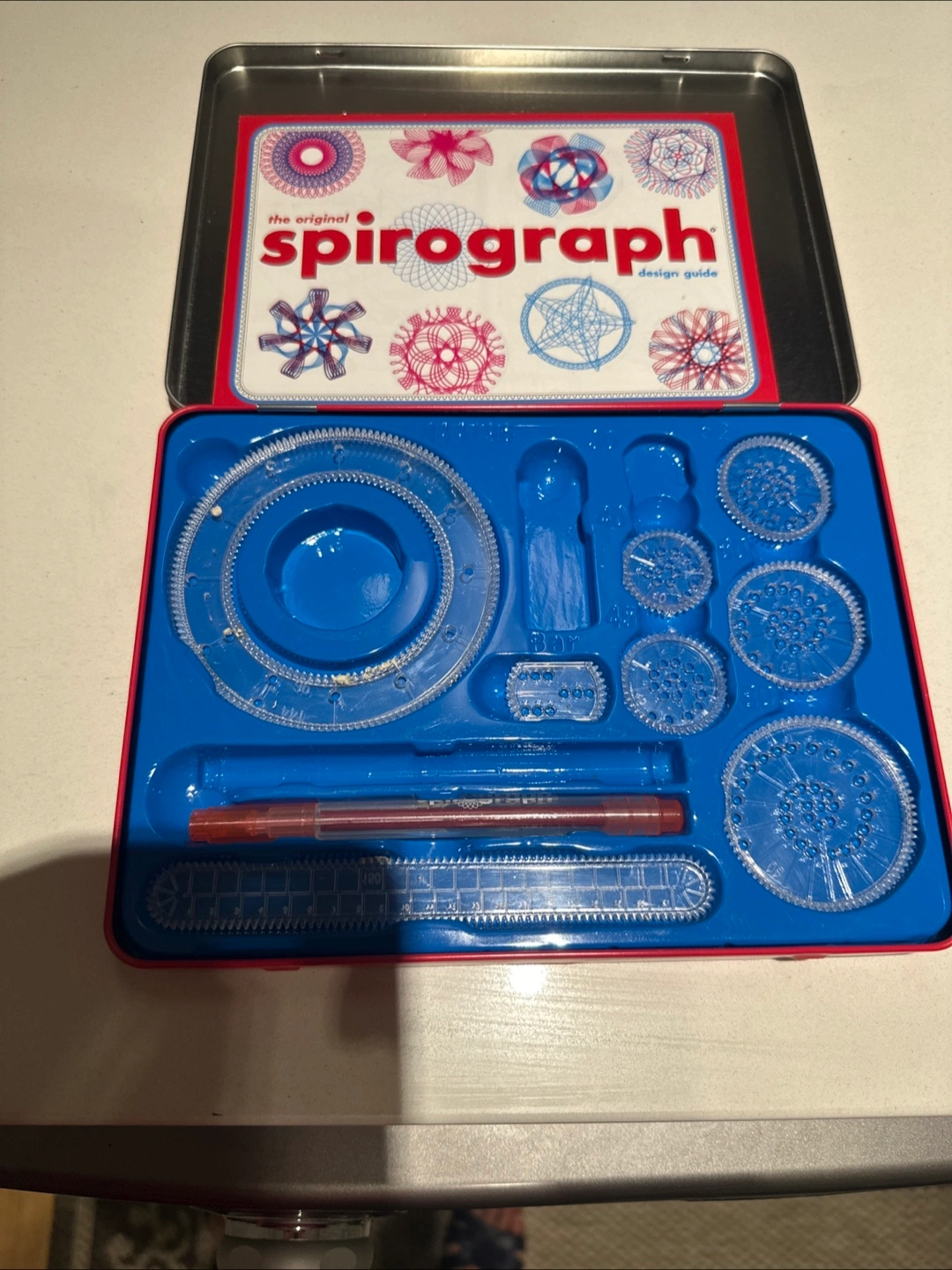 Selling a Spirograph design set! It looks like it's in great condition and comes in its original tin case. Perfect for creative drawing and design projects