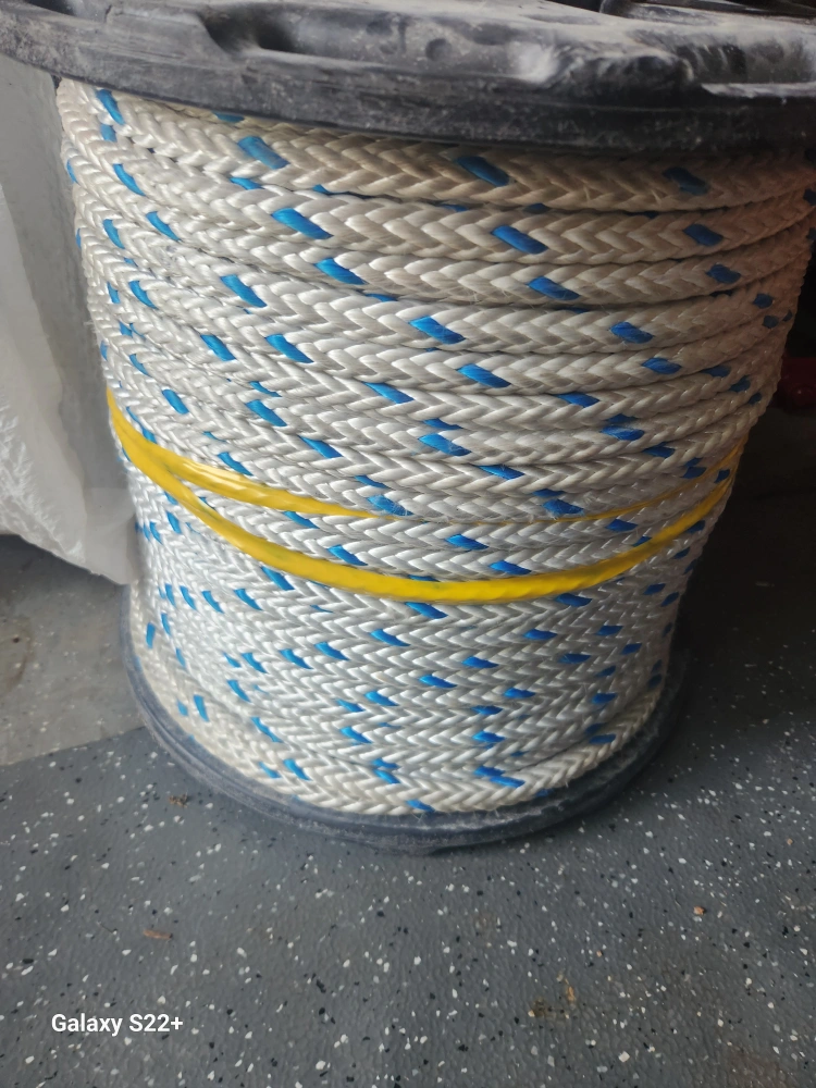 Selling a spool of braided rope. It's white with blue accents and appears to be in good condition. Perfect for various uses around the house or for projects!
