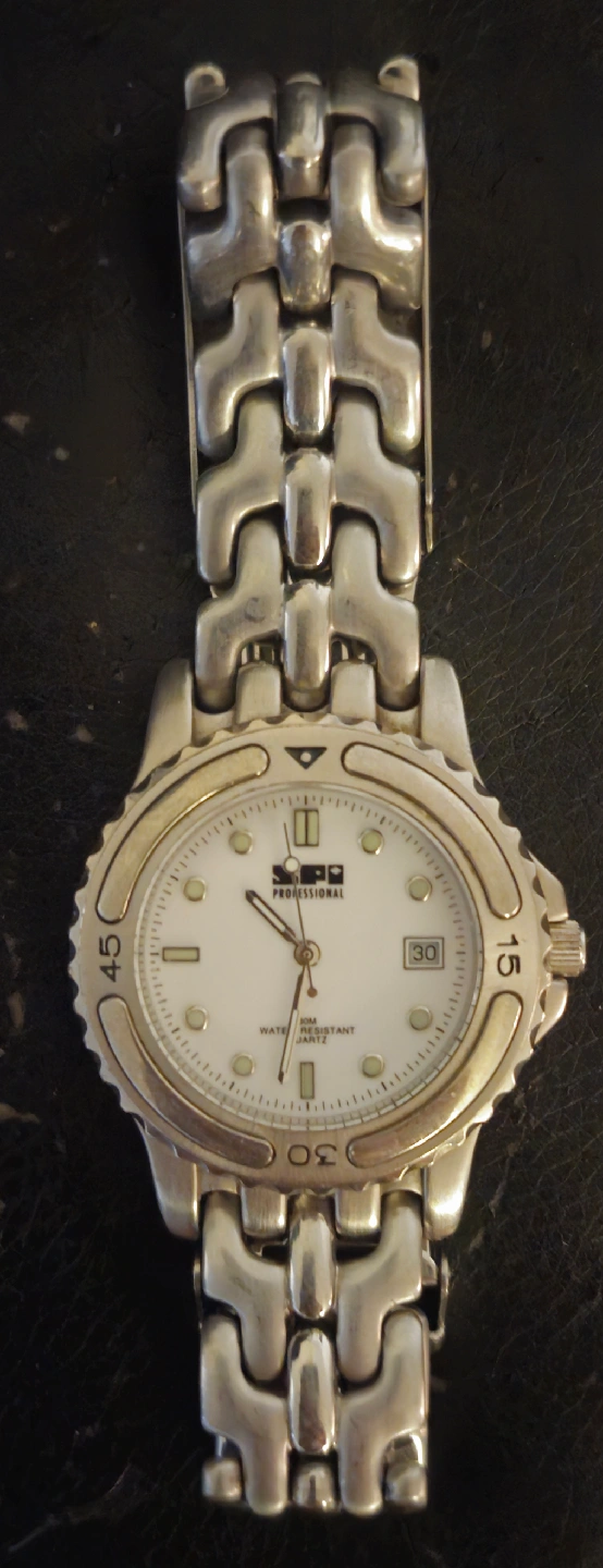 This is a SPP Professional women's watch with a stainless steel band and a mother-of-pearl dial. It features a date window and is water-resistant. The watch has some visible wear consistent with its age but is overall in good working condition. Additional details: * Brand: Lipp Professional * Movement: Quartz * Case Material: Stainless Steel * Band Material: Stainless Steel * Display: Analog * Features: Date Indicator, Water Resistant If the ad is up, it's available! Don't miss out on this timeless piece—it's always the right time to treat yourself!