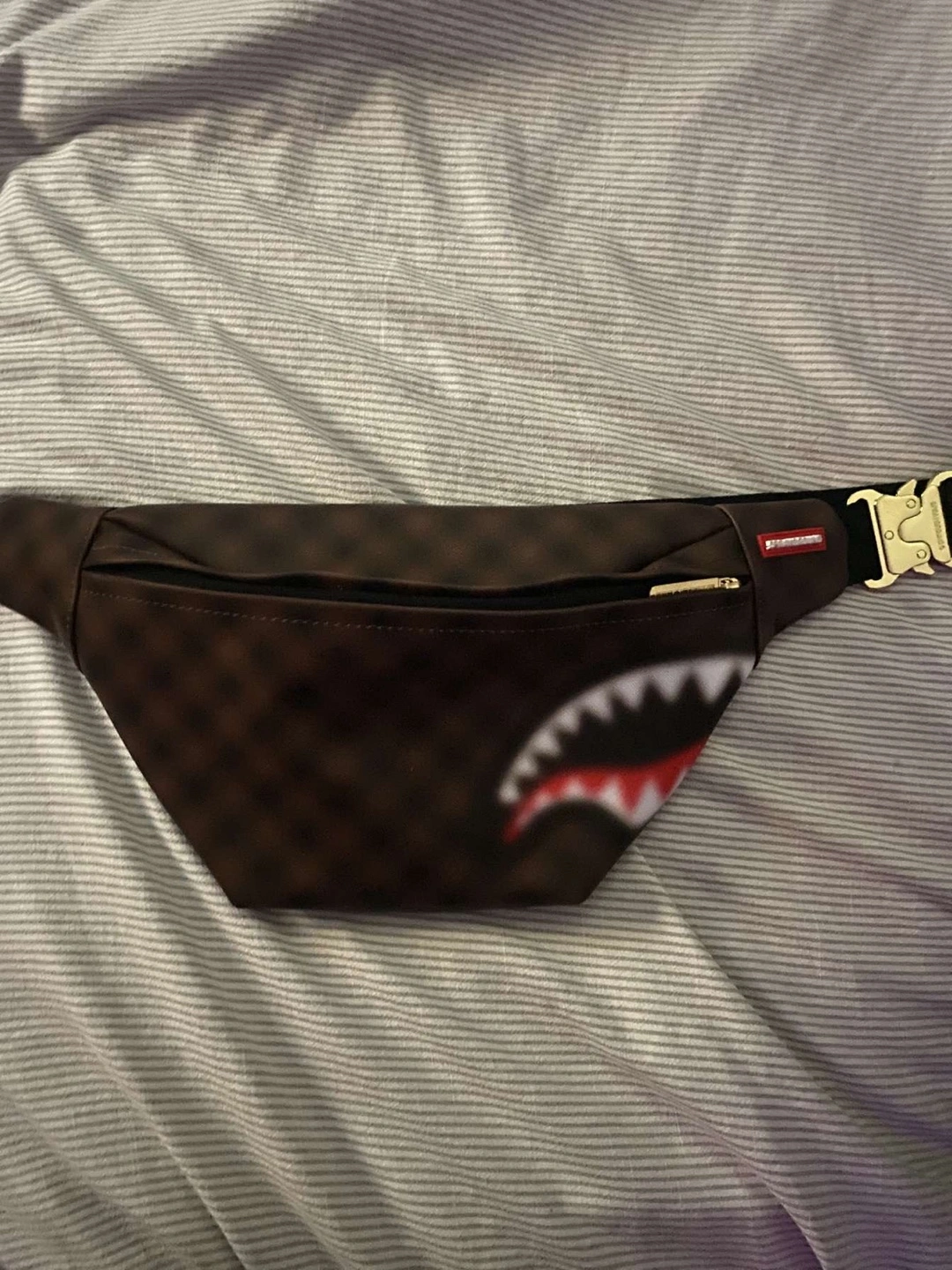 Selling a Sprayground waist bag from the Limited Edition series. It has a shark design on the front. The bag is brown with a gold buckle. Perfect for carrying essentials!