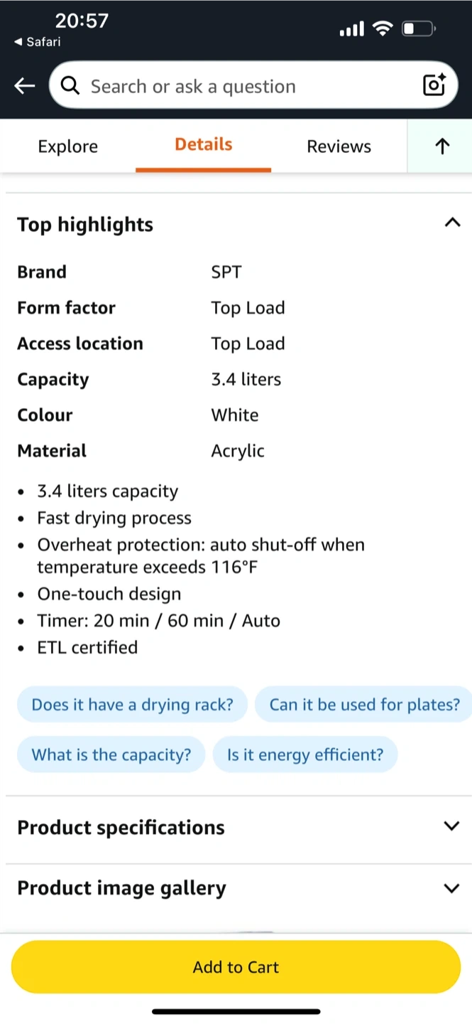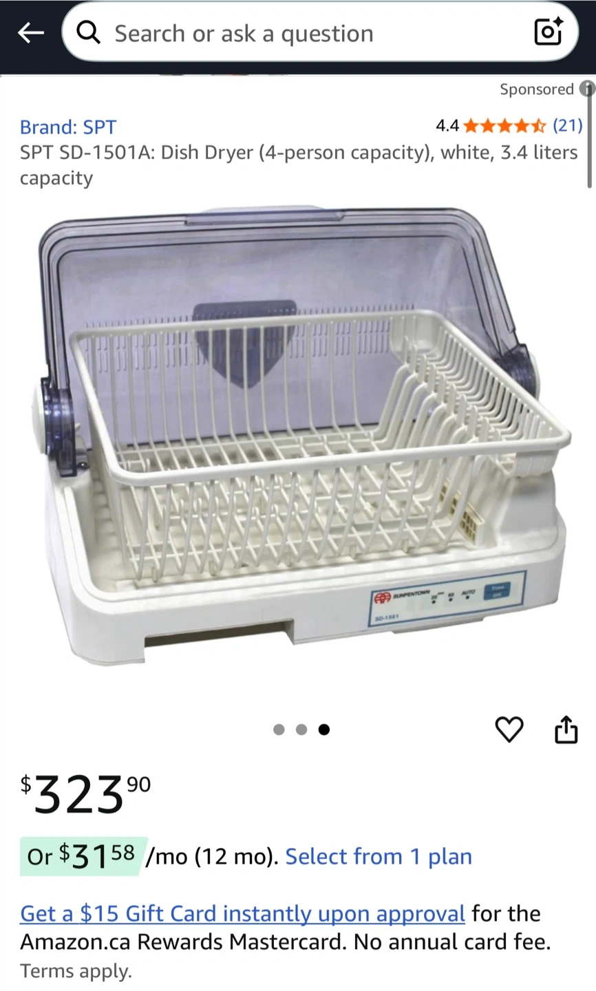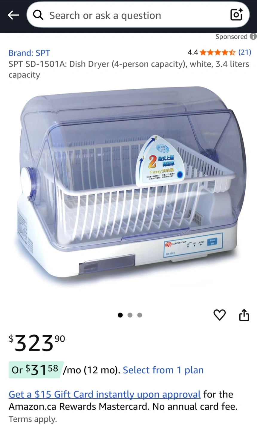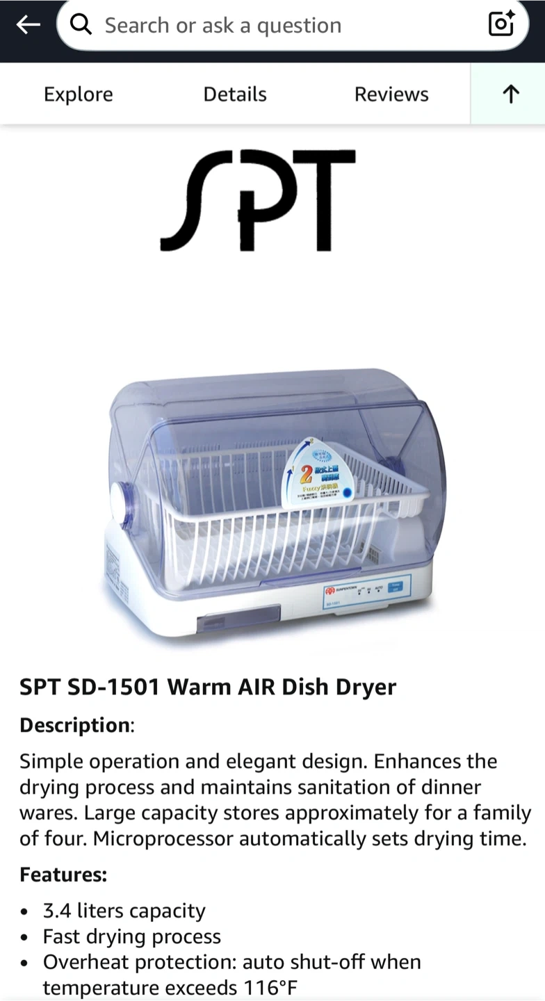 Selling a SPT SD-1501A dish dryer. It has a 3.4 liter capacity and is white in colour. Key features include: - Fast drying process - Overheat protection with auto shut-off - One-touch design - Timer: 20 min / 60 min / Auto