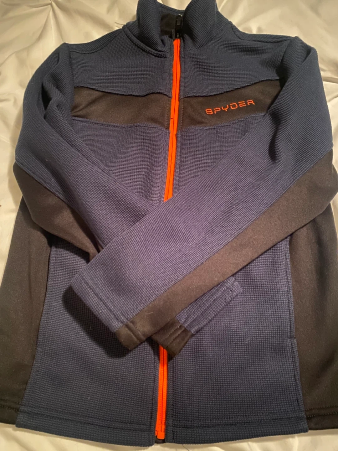 Looking to pass along this gently used Spyder full zip jacket! It's a stylish mix of blue and black, perfect for layering. The orange zipper adds a nice pop of colour. It's in great shape and ready for a new home! Sz 10-12 L