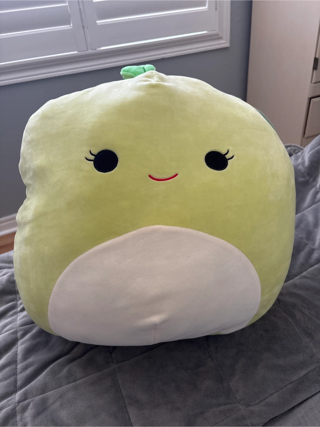 Cute Squishmallow plush in the Apple with white belly! It's a light green colour and in great condition. ORIGINAL SQUISH TAG STILL ATTACHED. Perfect for cuddling or as a decorative pillow!