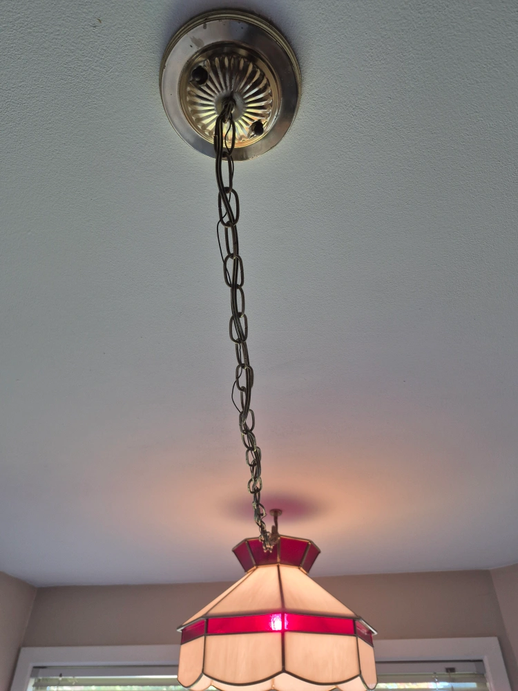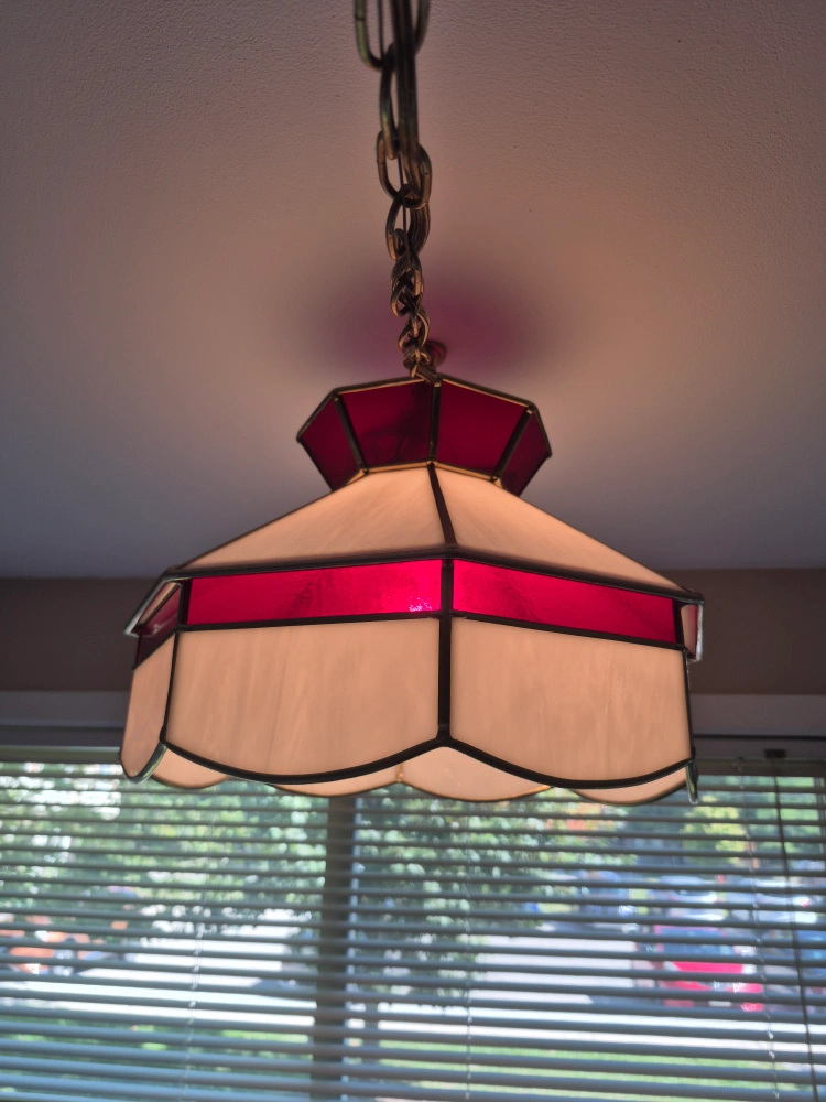 Selling a lovely stained glass hanging lamp! It features a classic design with red and white glass panels, perfect for adding a touch of vintage charm to any room. Vintage, real glass, Tiffany style. Pickup in Guelph.