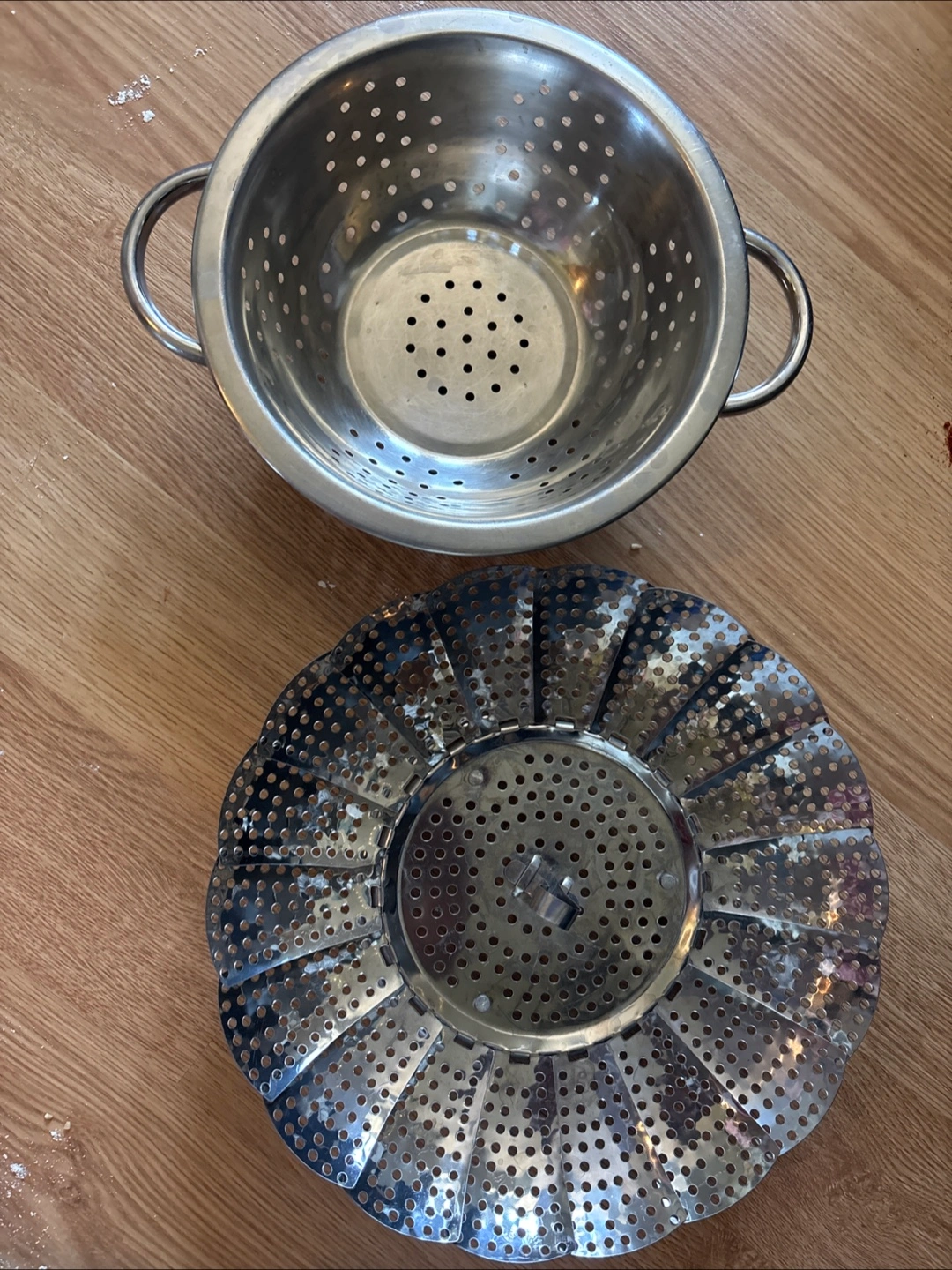 Selling a stainless steel colander with handles and a collapsible steamer basket. Both are in great condition and ready for a new kitchen! You can get one for $3 if you don’t want both.