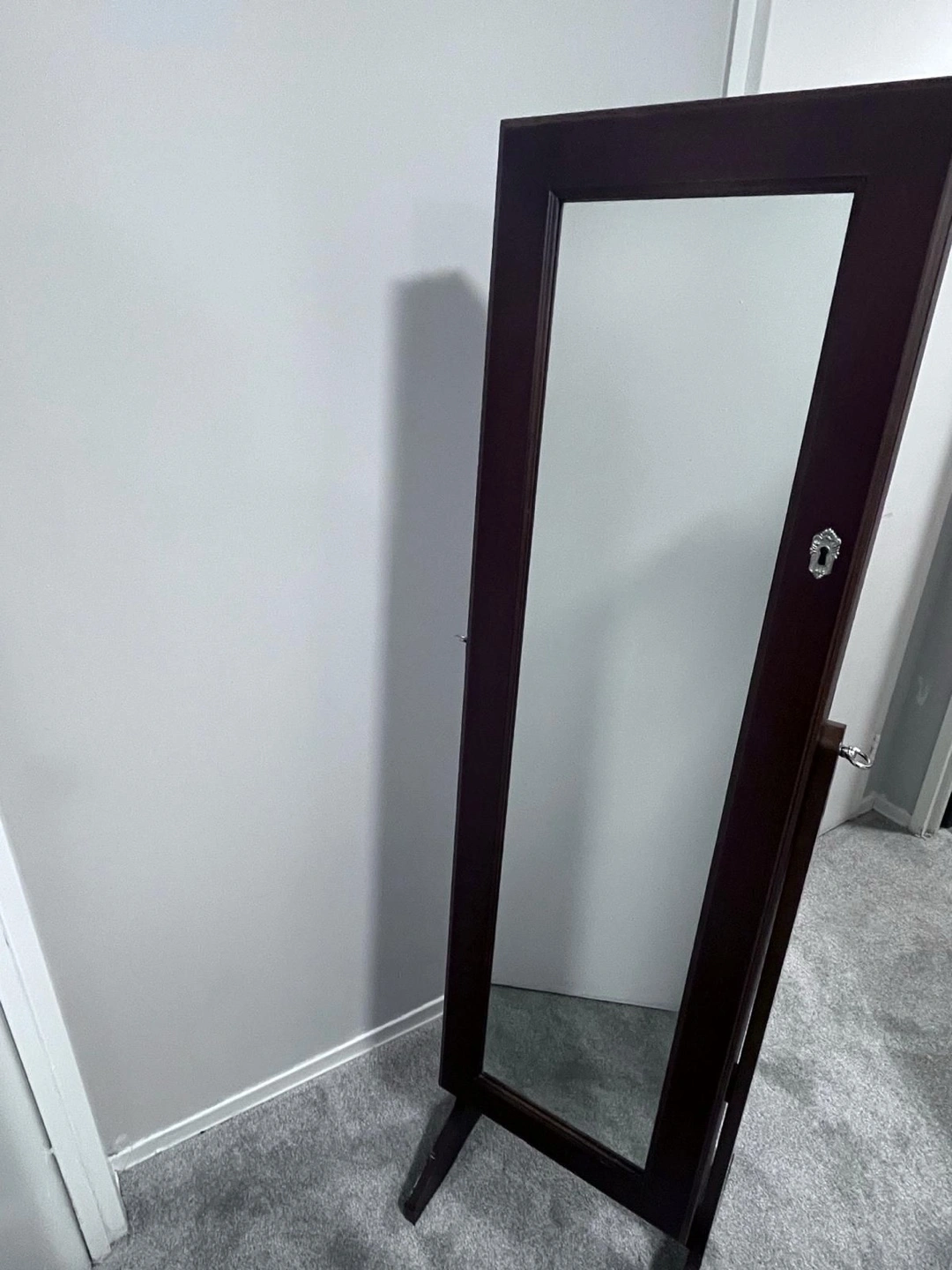 Selling a standing jewellery armoire in a dark brown colour. It's perfect for storing all your earrings, necklaces, bracelets, and other accessories. There are some minor scratches on the leg, as shown in the photos.