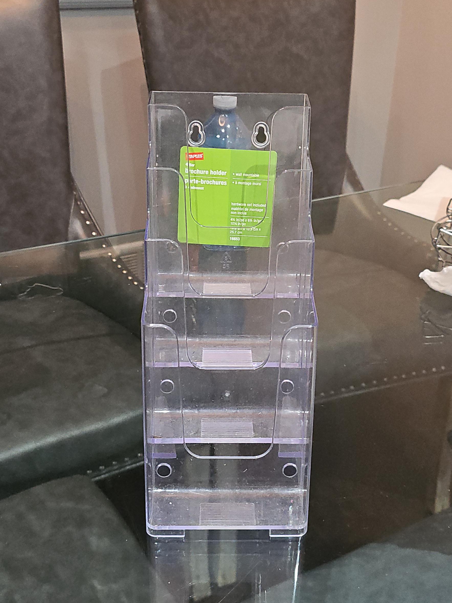 Selling a Staples 4-tier brochure holder! It's wall mountable, so you can easily display your brochures or flyers. The dimensions are approximately 4 1/4 in x 6 1/4 in x 10 1/8 in (25.7 cm) $15 obo