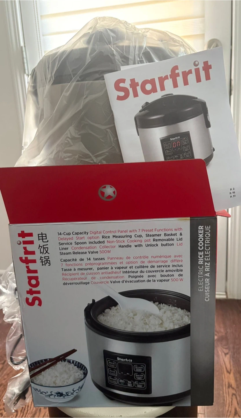 Selling a Starfrit electric rice cooker that's in excellent condition! It has a 14-cup capacity and a digital control panel with 7 preset functions, including a delayed start option. It also comes with a rice measuring cup, steamer basket, and service spoon. The non-stick cooking pot and removable lid liner make cleanup a breeze! The box is included.